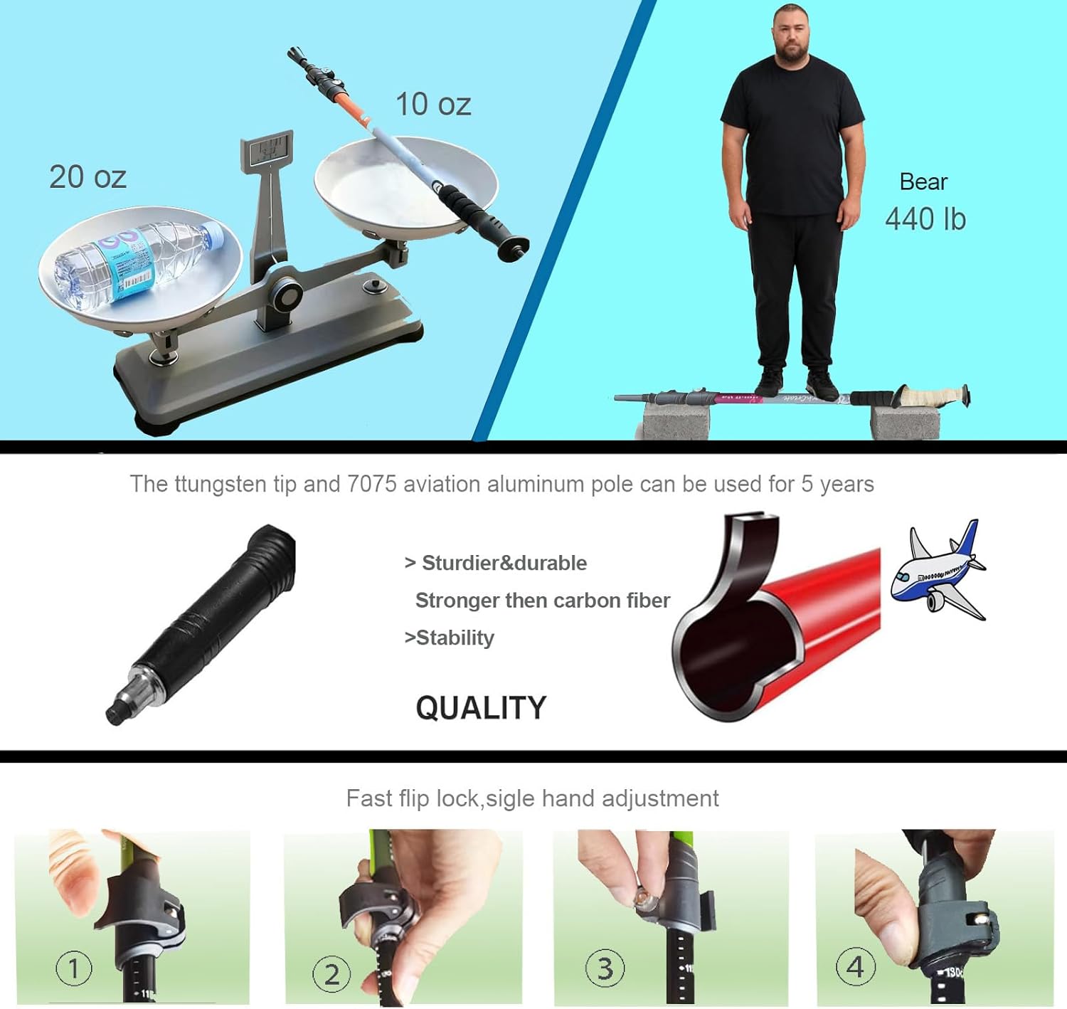 Built to Last on All Your Outdoor Adventures Engineered for durability, these trekking poles for hiking are made to withstand rocky paths, snowy slopes, and everything in between. More than just walking sticks, they are your reliable companions for all-terrain adventures. The robust construction ensures they will be your go-to hiking gear for countless journeys.