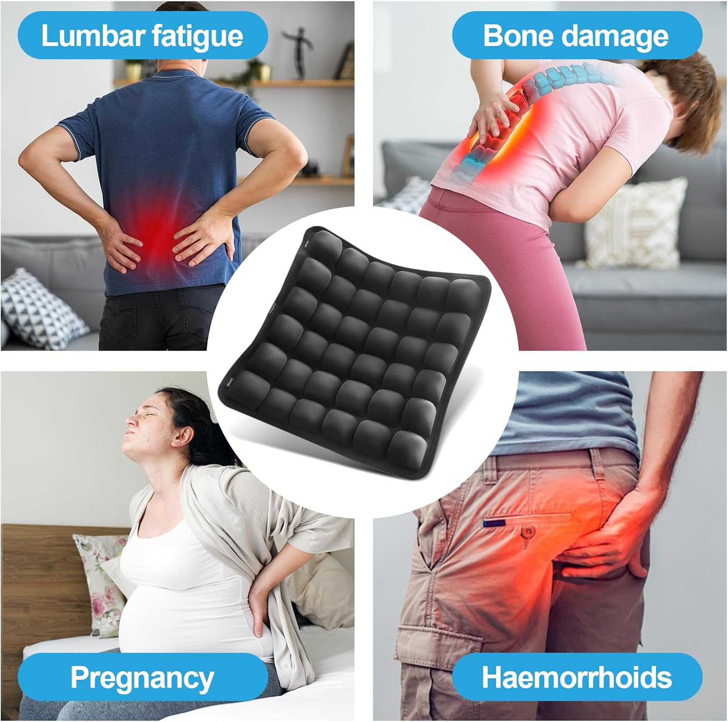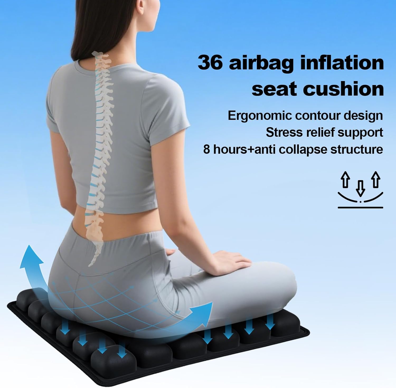Advanced 3D Air Cell Support Structure:Crafted from soft TPU with a 3D airbag design, this seat cushion features 36 interconnected air cells that flex and adapt to your movement. The outer cells offer firm support for your hips and thighs, while the center area gently cradles your tailbone—effectively relieving pressure and promoting natural spine alignment for all-day comfort.