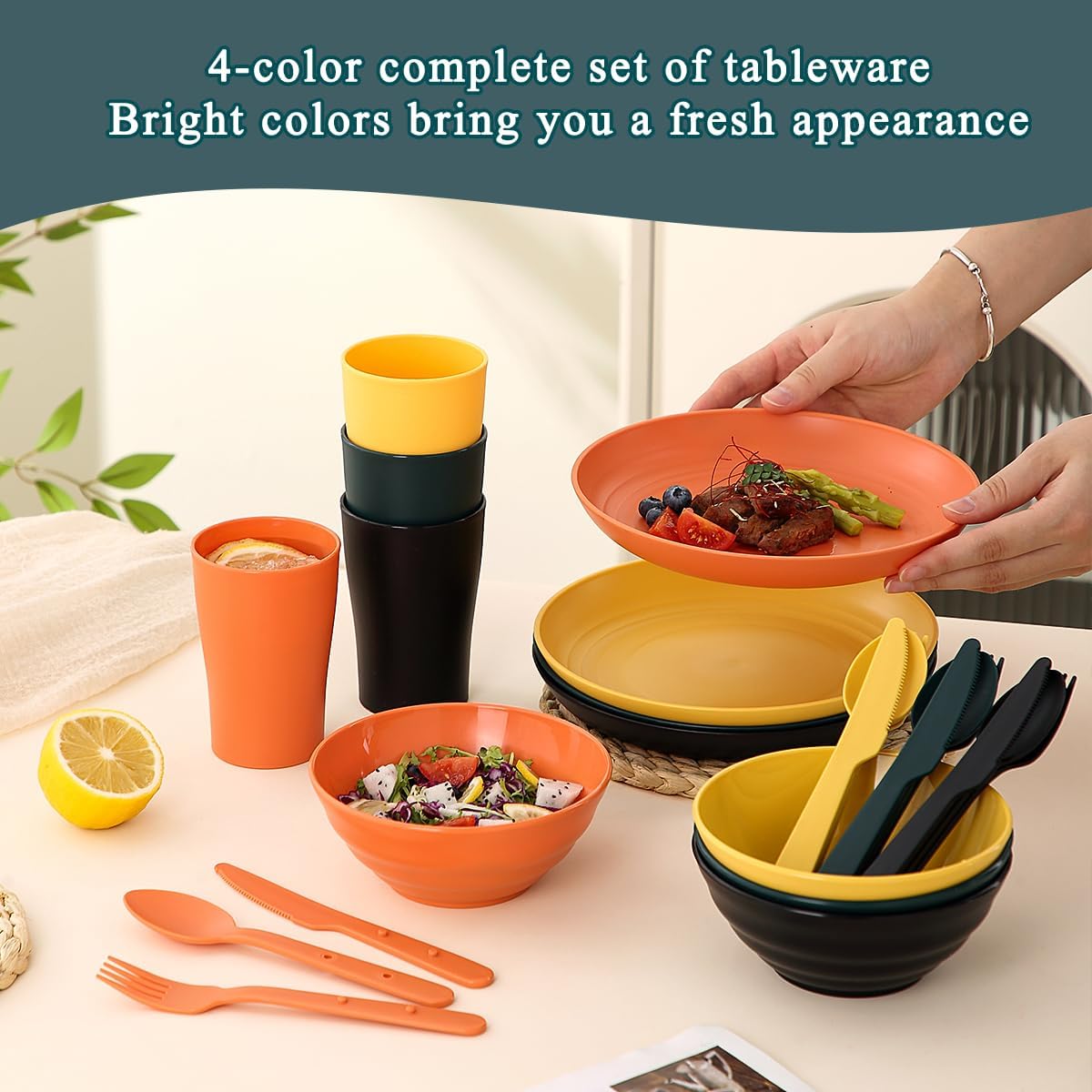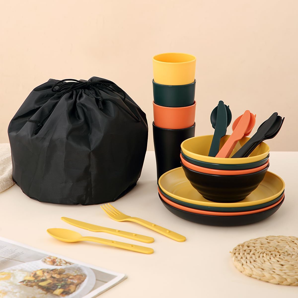1.Complete for 4: This all-in-one ReaNea Camping Mess Kit is designed to serve four people, including 4 plates, 4 cups, 4 bowls, 4 knives, 4 forks, 4 spoons, and a waterproof carry bag. Crafted from food-grade plastic, it ensures safe use for enjoying all your meals outdoors, providing everything you need for a hassle-free camping experience.
