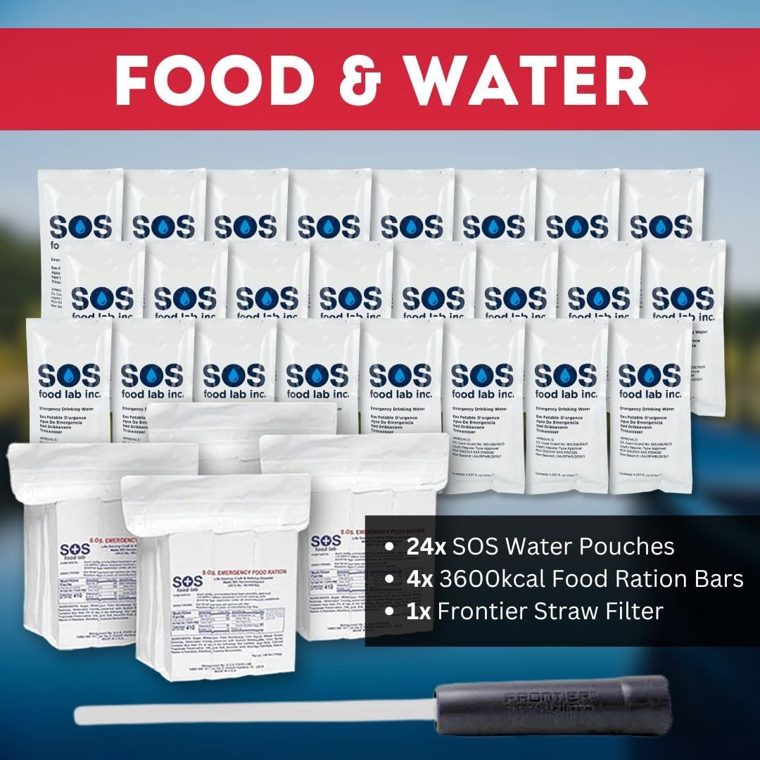 ✅【3x Purified Water】: In addition to the S.O.S brand emergency water pouches, this kit features a Frontier Straw Filter, giving you the power to use any water source. This innovative straw filters up to 30 gallons of water.