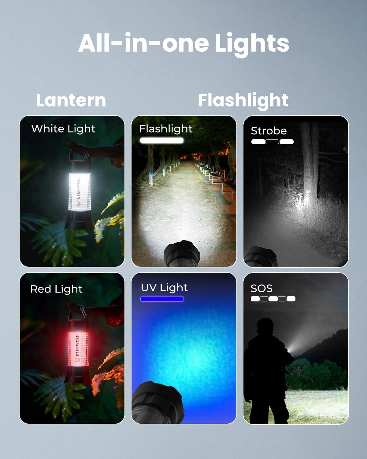 MULTIPLE USE SCENARIOS: The ETENWOLF 2-in-1 Lantern and Flashlight is essential survival gear for camping, hiking, fishing, hunting, and night walking. The UV light supports nature exploration and quick checks, while the red light mode helps reduce bugs. Built-in strobe SOS modes help handle outdoor emergencies.Ii is an essential portable light for outdoor use and emergencies