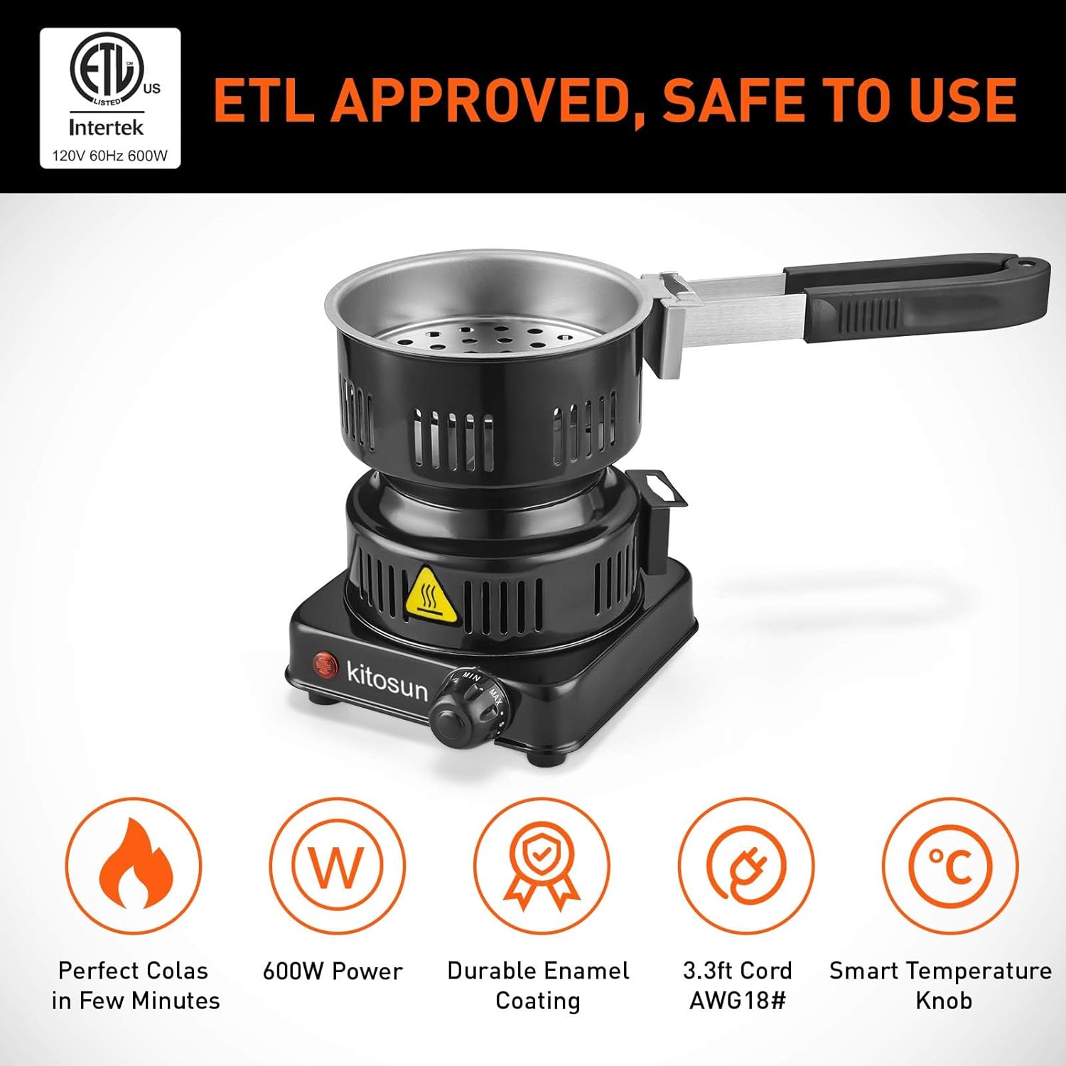【600W Electric Stove -ETL Approved】: ETL Approved, Afoosoo electric stove is 100% safe to use, also have overheating & circuit protection. Feature in 120V ~ 600W, the electric coil burner heat up fast, only need 10-13 minutes, all sides of the coals will be blazed red. The quick light charcoal tablets will be ready to use in one minute.
