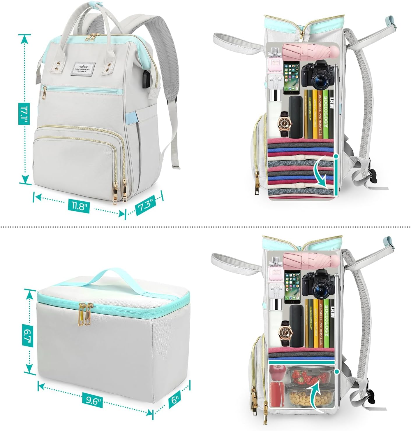 2-in-1 design backpack for women can be used as a lunch bag or a laptop backpack. When you store food or fruit on the lunch bag, main compartment area will be reduced to provide more space for food container compartment. The inner folding board has a built-in support to prevent food from being crushed by heavy objects. When you don’t need to carry food, the insulated layer can be folded so that you can carry more items in main pocket. The detachable carry lunch bag is also a nice touch