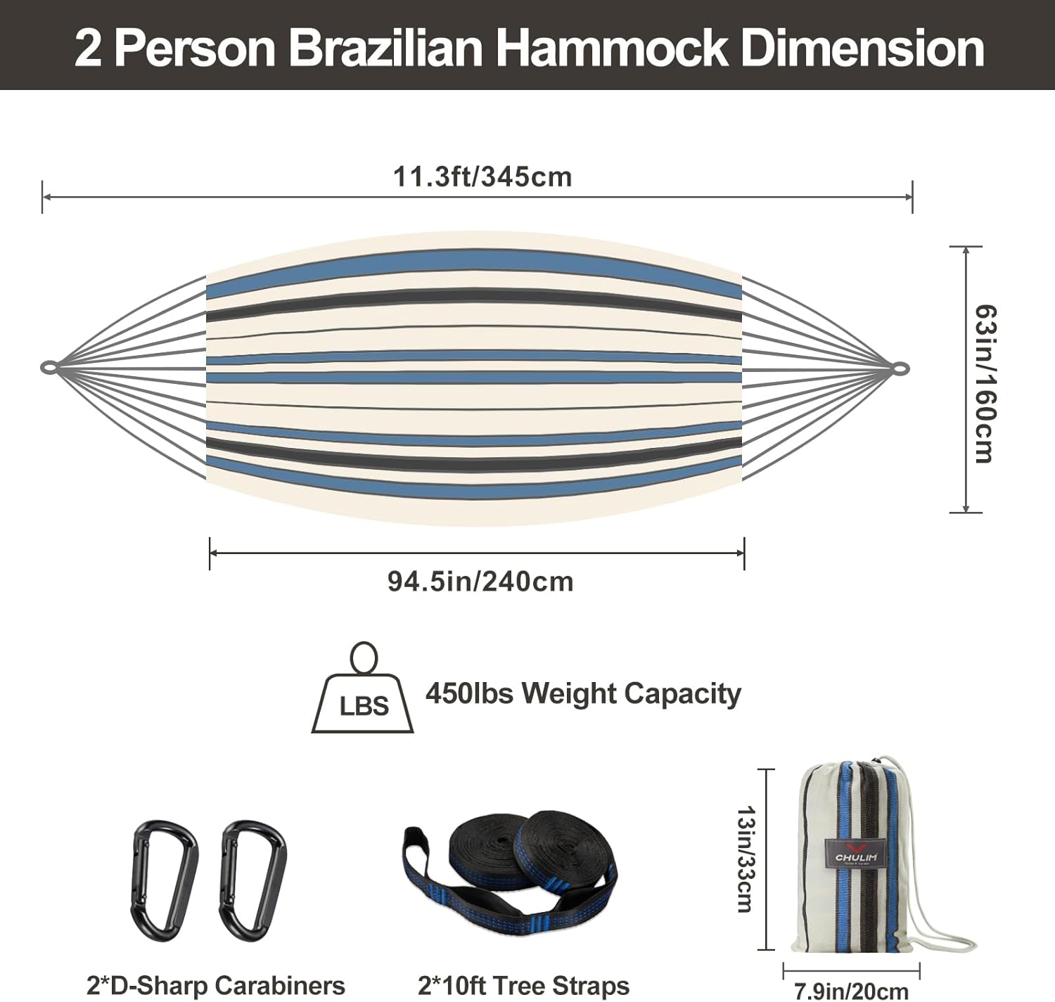 Large Hammock Bed for Two Persons,the hammock bed dimension is 94.5*63 inches/240*160cm,it provides sufficient and incomparable space for two persons, the overall length includes rope is 11.3feet/345cm,it fits most double hammock stand on the market.