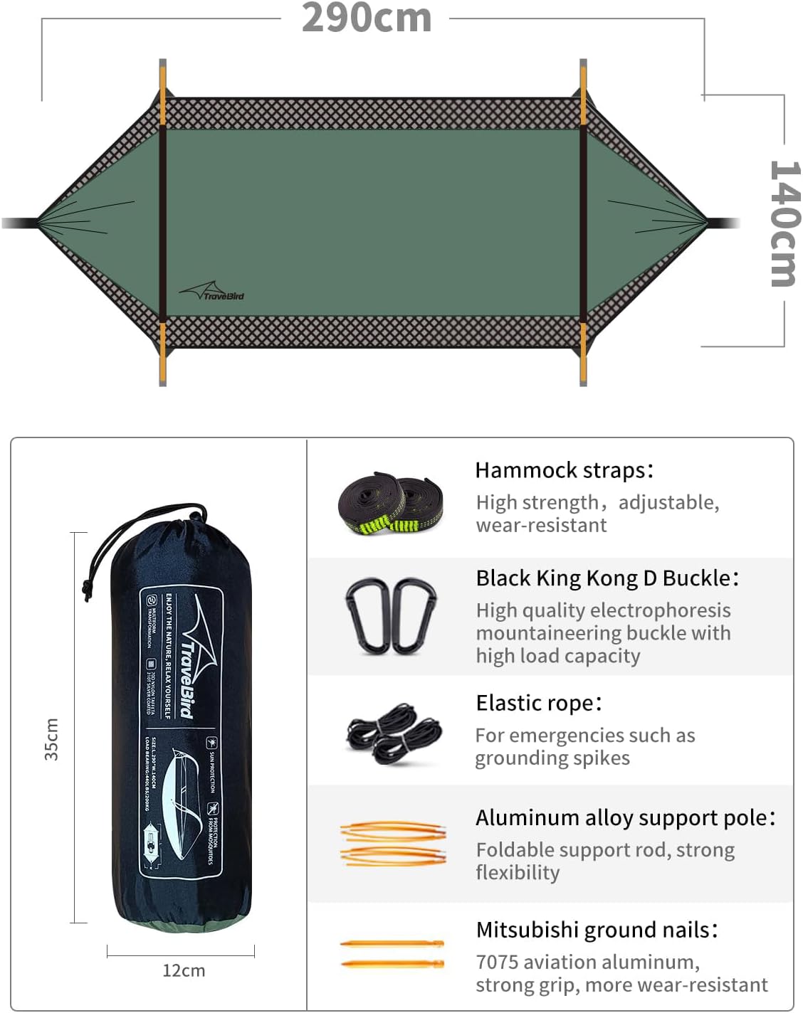 ✅【3 In 1 Multifunctional Camping Hammock】Experience comfort and flexibility with our portable hammock that combines three functions: 1) a hammock with netting mosquito, 2) a traditional tree hammock, and 3) a ground hammock tent. Travel Bird hammock tent meets your different demands in camping, backpacking, hiking, outdoor trip, or just hanging and relaxing in backyard.