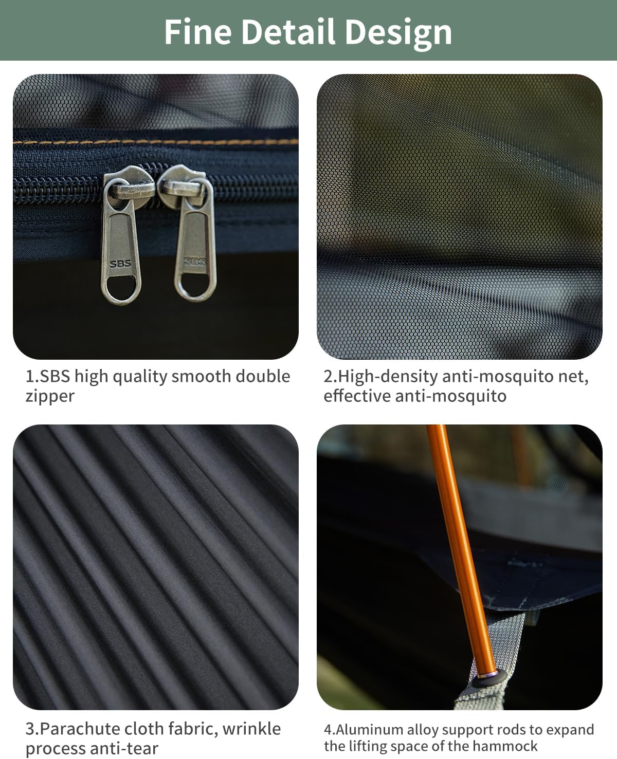 ✅【Easy Setup & Complete Kit】Our hammock tent comes with everything you need for a quick and easy setup: 2 foldable aluminum support poles, 2 carabiners, 2 adjustable hammock tree straps, and a storage bag. Unlike traditional hammocks with complex ropes, our setup is hassle-free, saving you time and money.
