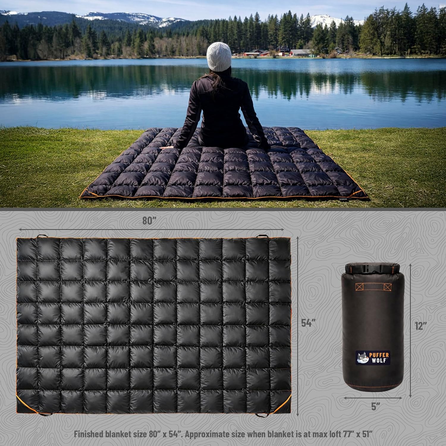 ✅ EXTRA WARM, LARGE & TRAVEL READY: Designed for camping, hiking, road trips, van life, festivals, and everyday use, the Puffer Wolf outdoor blanket delivers serious warmth in a lightweight, packable design. Extra-large at 80” x 54” (approx. 77” x 51” fully lofted), it provides full-body coverage while still compressing small into the included premium stuff sack (approx. 5” x 5” x 12”). Perfect as a camping blanket, travel blanket, stadium blanket, or cozy couch throw.