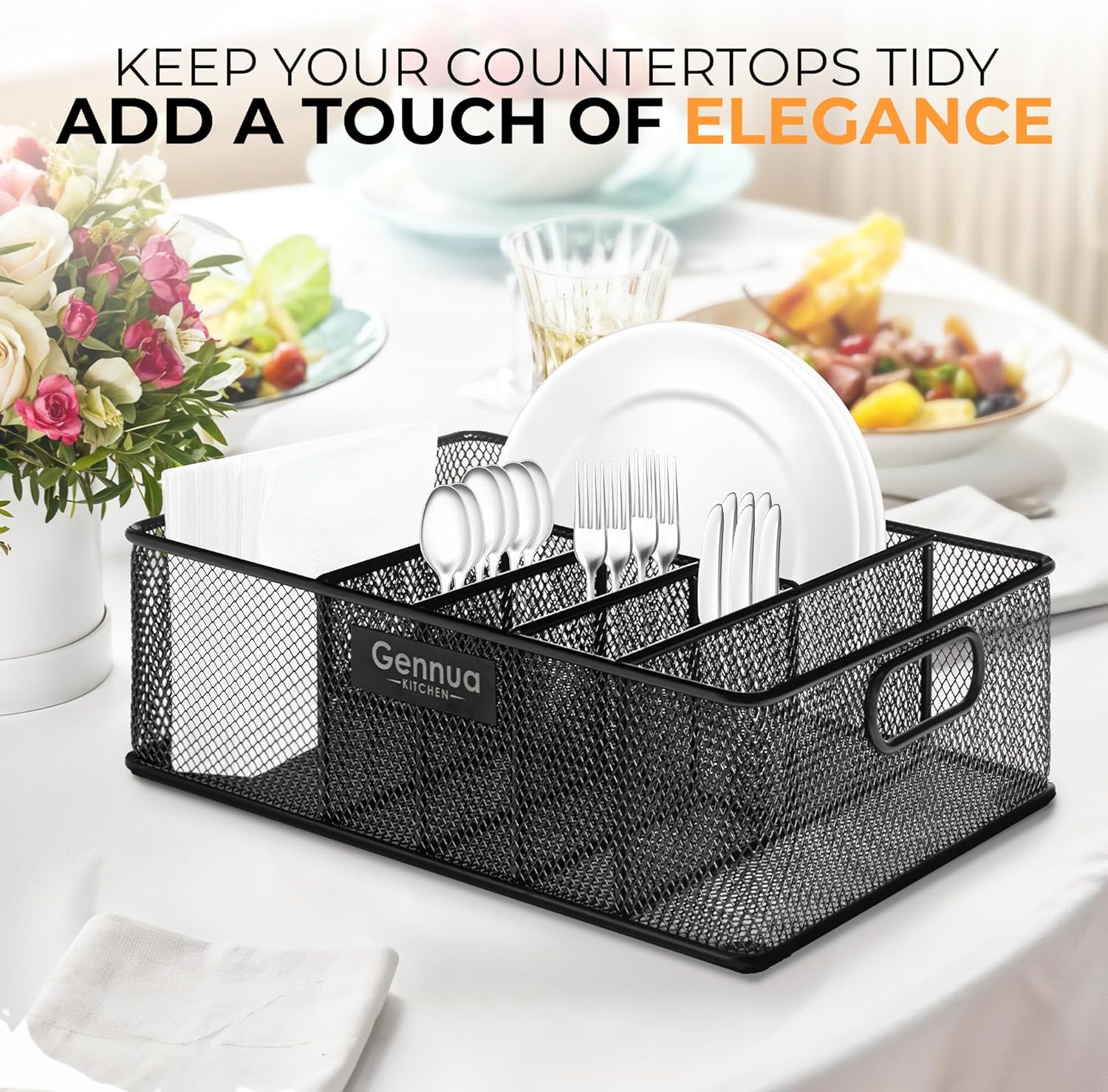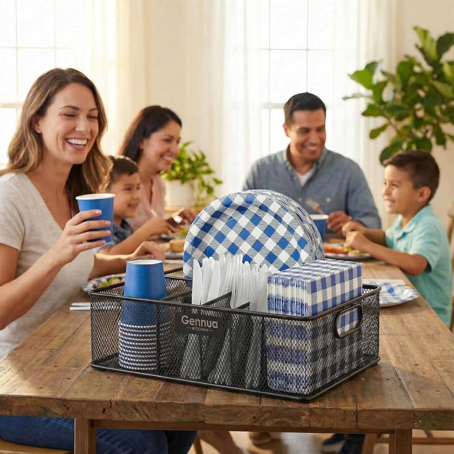 Premium Black Iron Mesh Construction: Forget flimsier paper plate holders. Our skillfully crafted plate and utensil caddy features thick, sturdy iron mesh, built to withstand daily wear & tear.