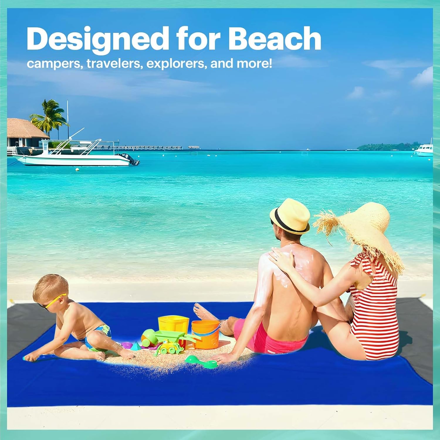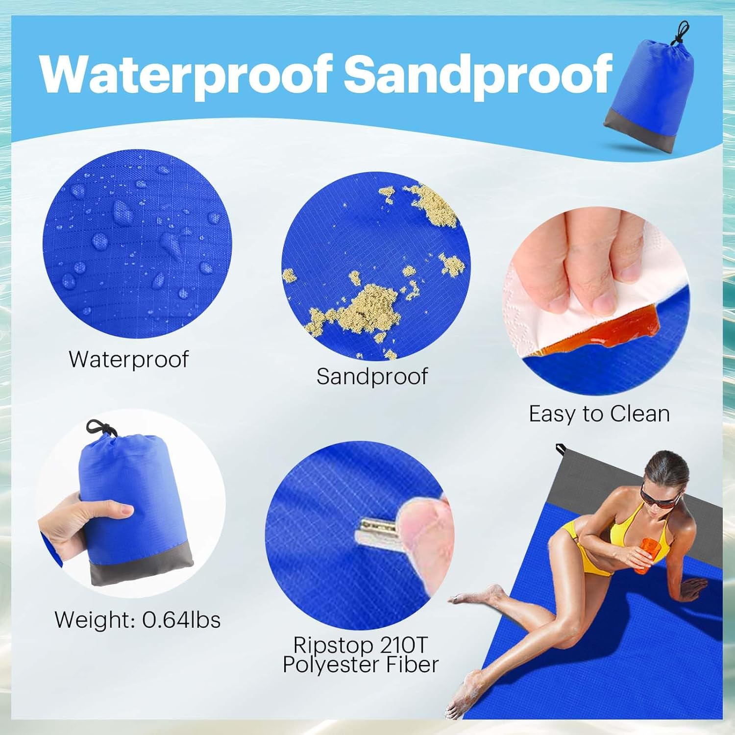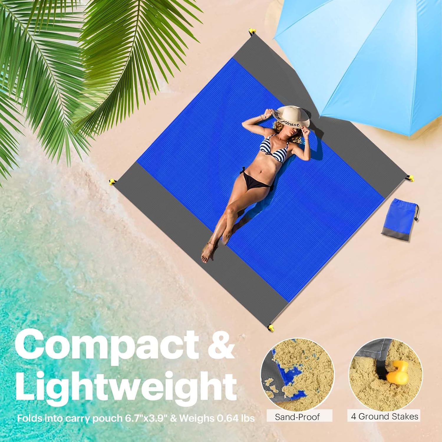 LARGE SIZE DESIGN: The extra large beach mat is specially designed for family travel, providing enough space to lie down, rest and relax. Beach mat waterproof set includes 1 beach blanket, 4 stakes, 1 carabiner. Beach blanket measures 79″ x 83″, sleeps up to 7 adults, and weighs 12 oz.