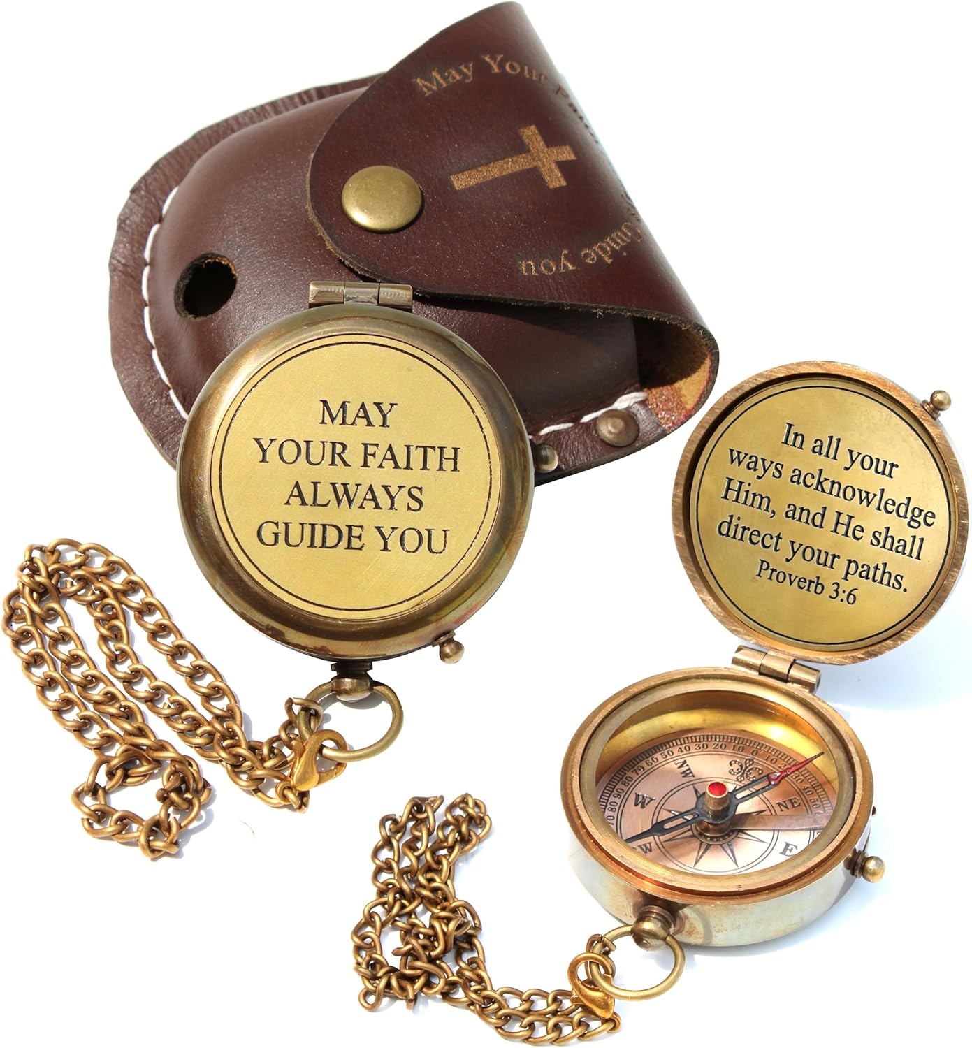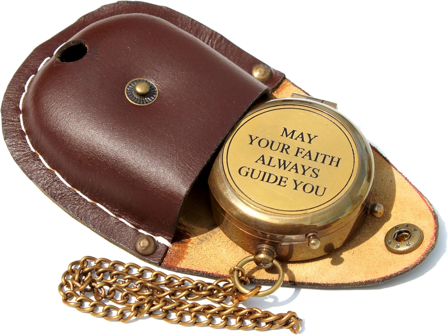 Solid Brass Compass Antiquated Brass Finish With May Your Faith Always Guide You Quote Engraved Compass with Leather Case