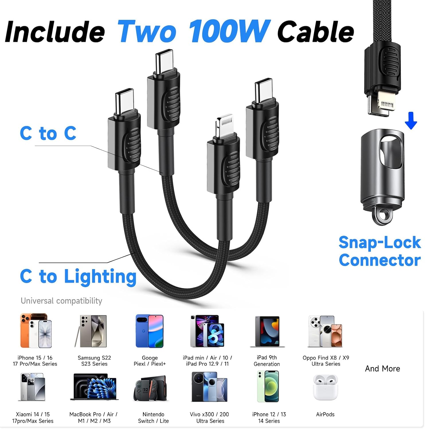 Universal Compatibility : Works flawlessly with iPhone 17/16/15, iPad Pro/Air, Samsung Galaxy, Google Pixel, and more. The set includes both Type-C to C and Type-C to Lightning cables, meeting all fast-charging needs for iOS and Android users.