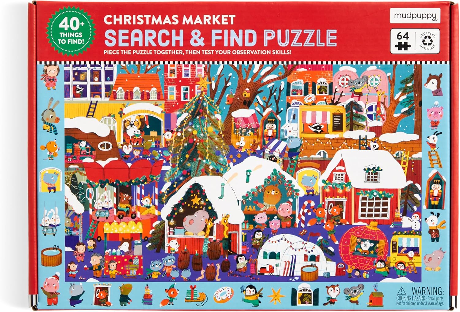 64-PIECE PUZZLE – The Christmas Market 64 Piece Search and Find jigsaw puzzle from Mudpuppy is just the right level of challenge for children ages 4 and up. Featuring a scene full of Christmas adventures, the finished puzzle measures 23” x 15.5” so doesn’t require much space to put together. Makes a great gift!