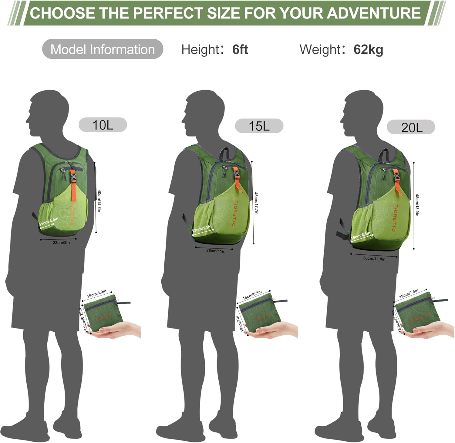 Compact & Hiking Backpack: FIORETTO packable mini backpack measures 17.7″ H x 11″ L x 5.1″ W (45x28x13cm) and weighs just 10.95oz, offering a 15L capacity ideal for minimalist adventurers, day trips, and hiking, or daily commuters. Slip it into luggage as a lightweight backpack or wear it solo for hands-free travel. Always verify that the dimensions match your needs before purchasing.