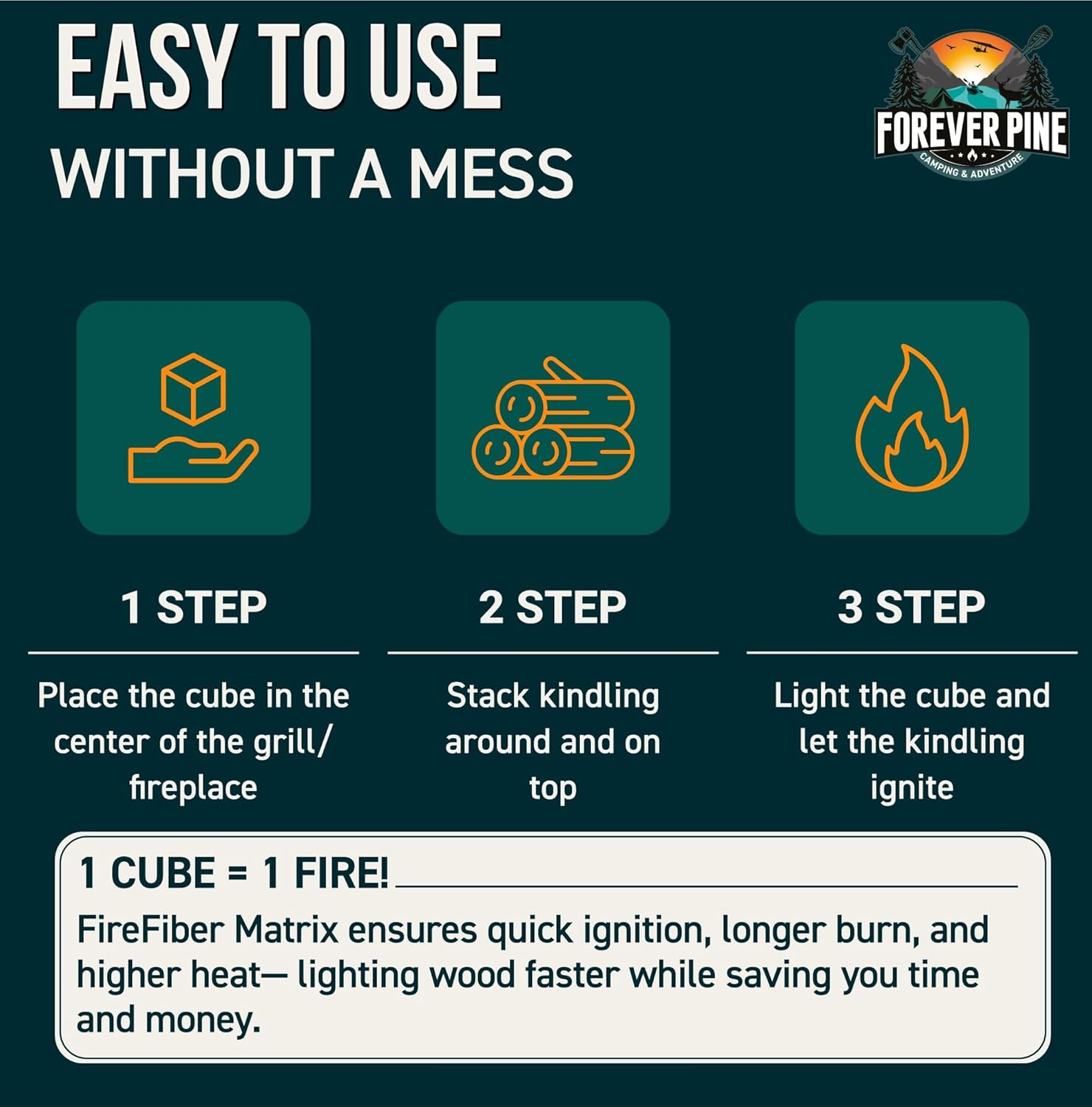 FIREFIBER MATRIX TECHNOLOGY – Exclusive wax blend and microfiber – cubes catch a fire in 1-2 sec and burn with a high flam. Optimal for fireplace, fire pits, camping, cooking, and outdoor grilling.
