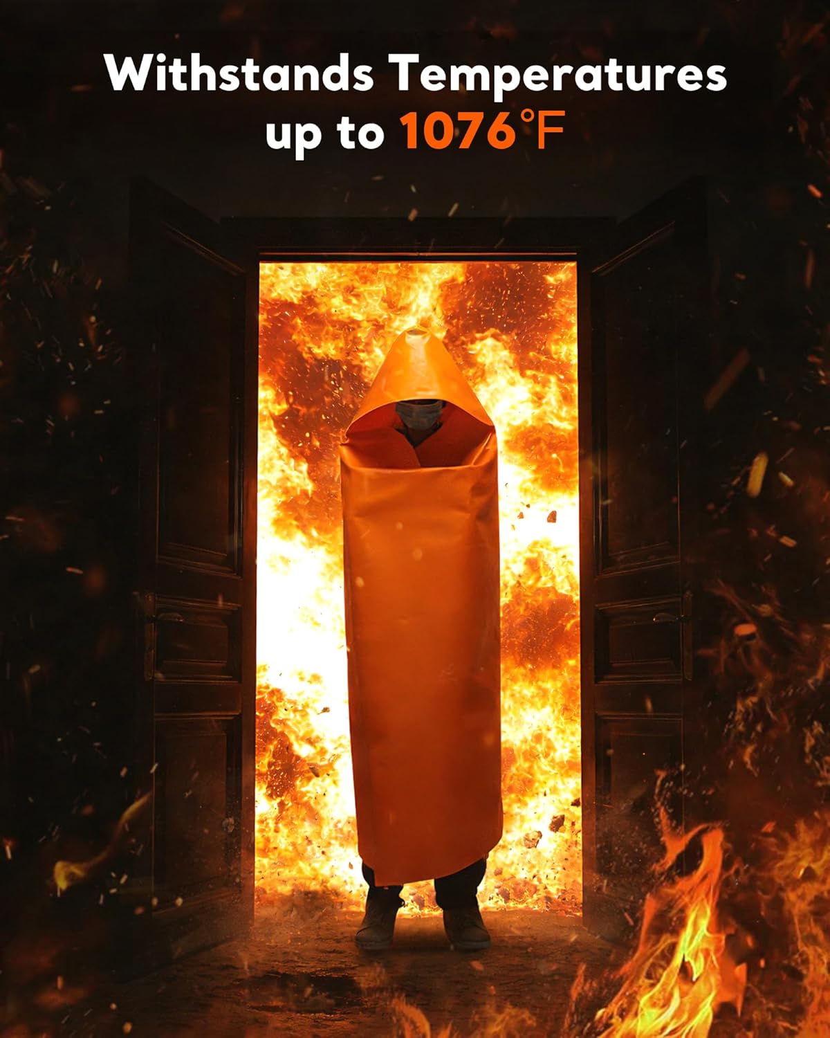 🌡【High-Temperature Resistance】Made to withstand temperatures up to 1076°F (580°C), this fire escape cloak is constructed from heat-resistant materials suitable for short-term exposure during emergency scenarios. The material is intended to help reduce heat transfer and protect clothing and skin from direct exposure while escaping or shielding oneself. Designed for household preparedness, it offers an added layer of protection when every second matters.