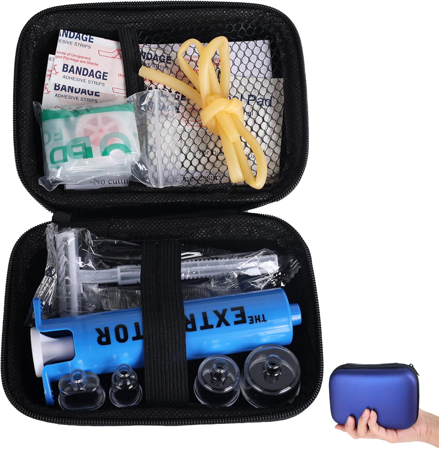 Venom Extraction First Aid Kit: This snake bite kit includes 1 extraction pump, 1 razor, 4 differently shaped suction cups, 1 rubber tourniquet, 2 plasters, 2 alcohol swabs and 1 CPR mask. It enables you to manage snake and insect bites effectively outdoors, maximising your window for optimal treatment.