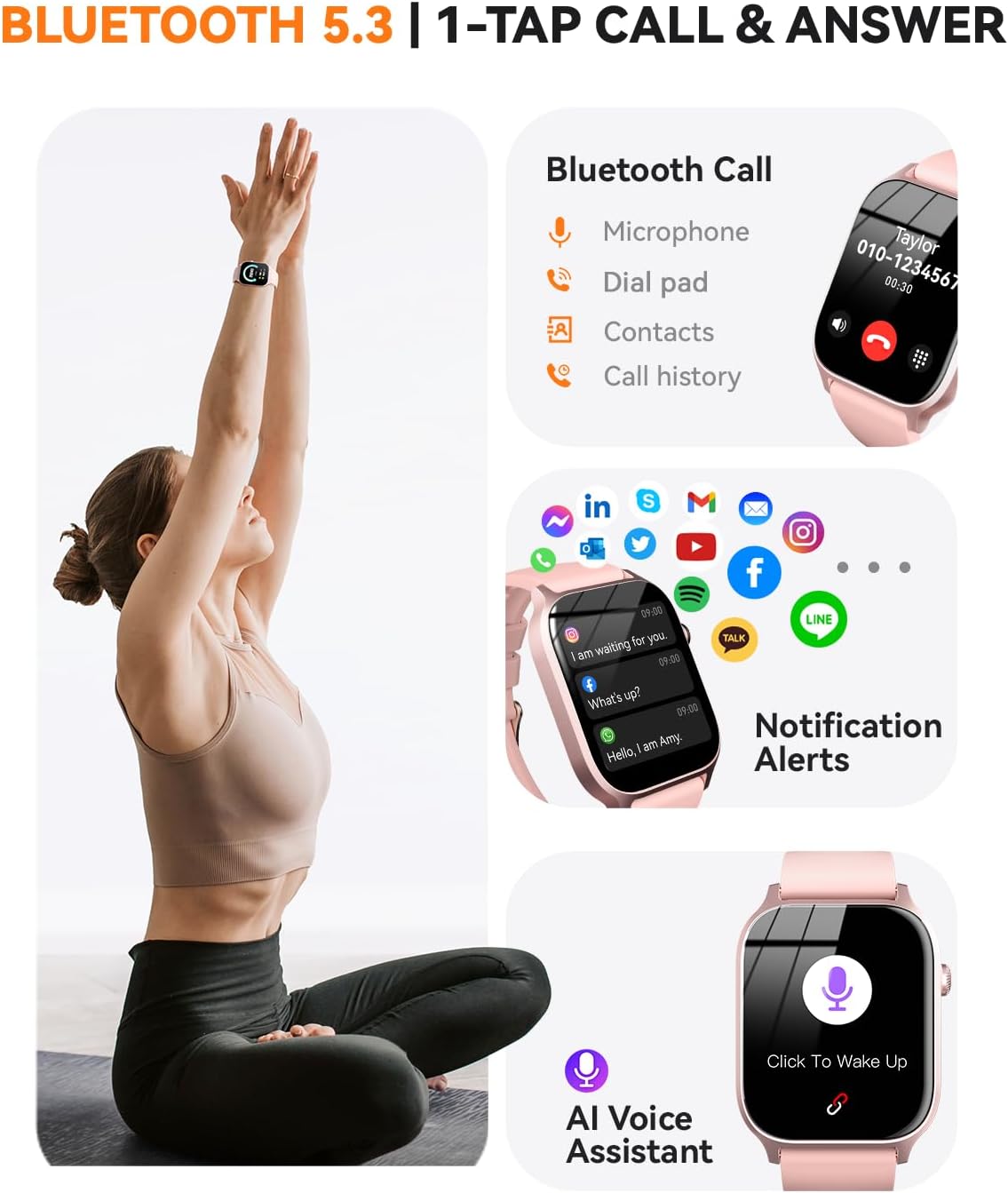 【Consistent Bluetooth Calling】This men and women smart watch comes with the latest Bluetooth 5.3 technology, delivering superior call performance, extended wireless range, and minimized power drain. Stay connected via vibration alerts for incoming calls, text messages, and notifications from apps including Facebook, WhatsApp, and Instagram.