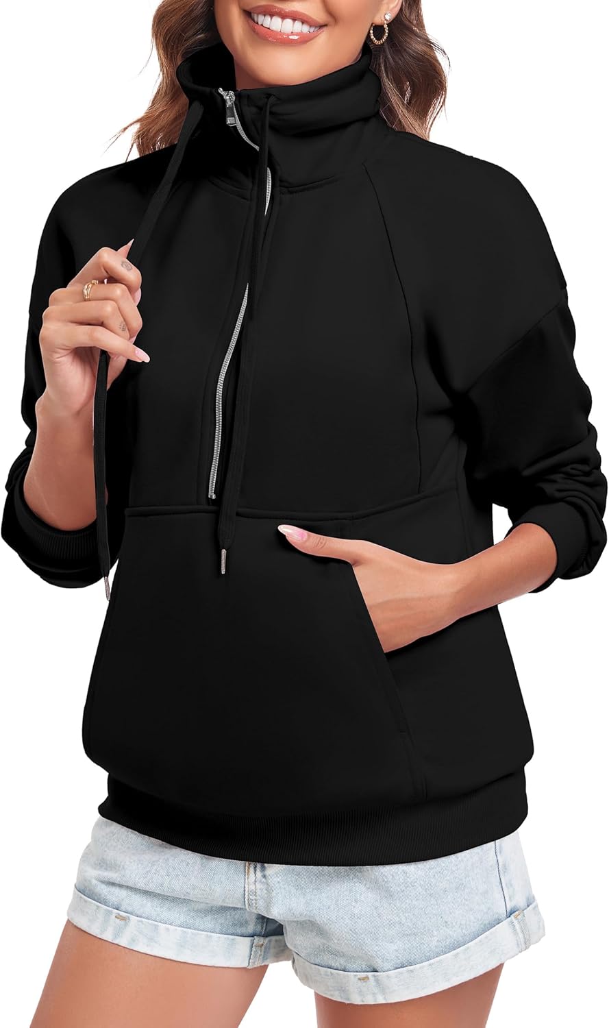 FKEEP Quarter Zip Up Sweatshirt Women Fashion Zipper Neck Drawstring Blouse Top