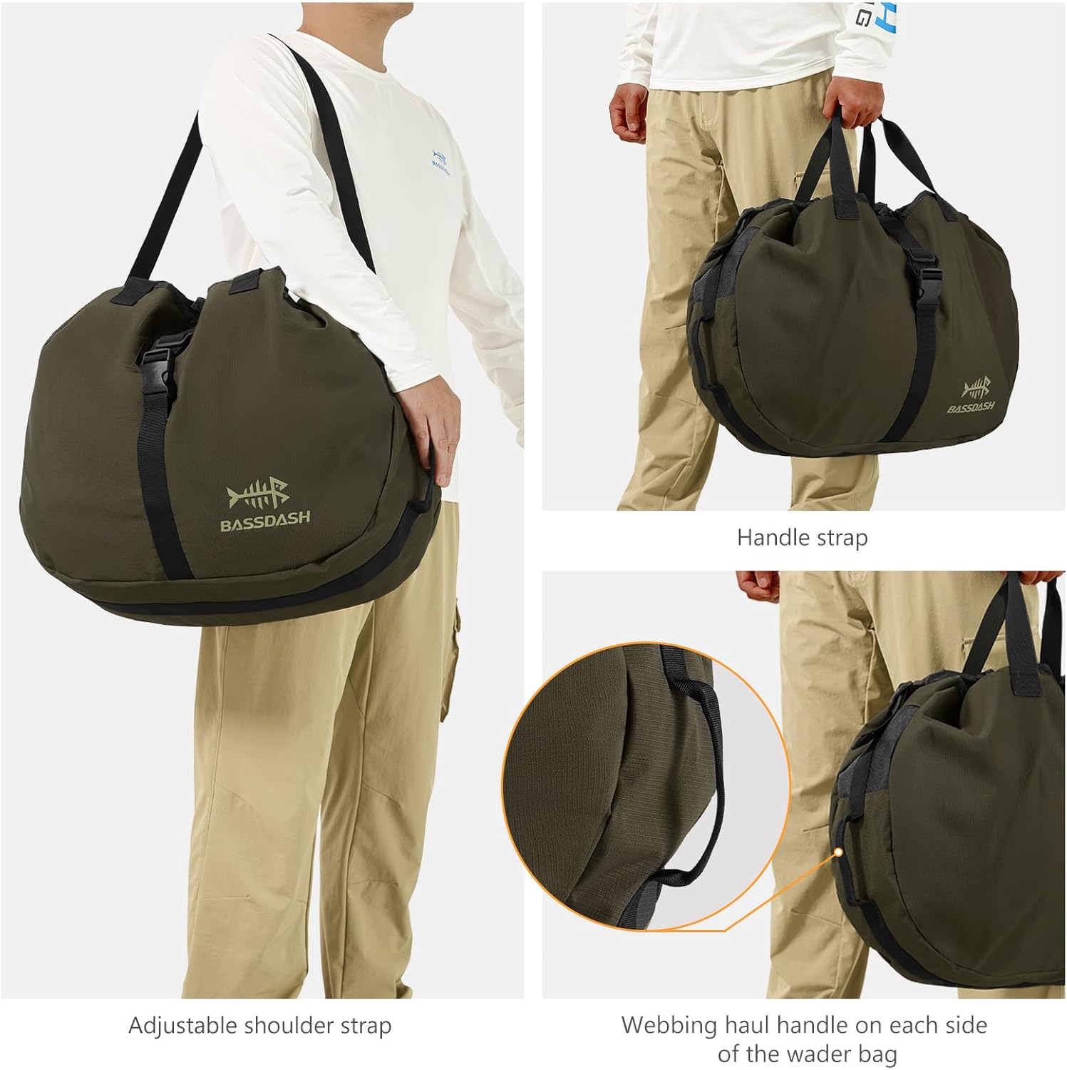 Massive 48L (27.9 × 17.7 × 5.9 in) Capacity: Holds up to 1 stockingfoot wader, 1 pair of wading boots and 1 landing net; Or 1 neoprene bootfoot wader and 1 landing net. Secure gear with the drawstring closure and adjustable buckle