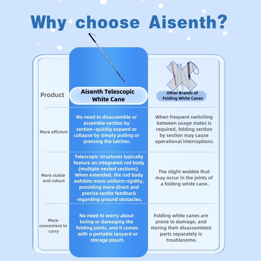 Lightweight & Travel-Ready Design: This lightweight telescopic cane is designed for easy carry and everyday convenience. It fits in a purse or backpack and collapses down compactly, making it ideal for travel, commuting, and on-the-go use without added bulk. The cane is portable and travel friendly, ensuring you can take it anywhere without any hassle.