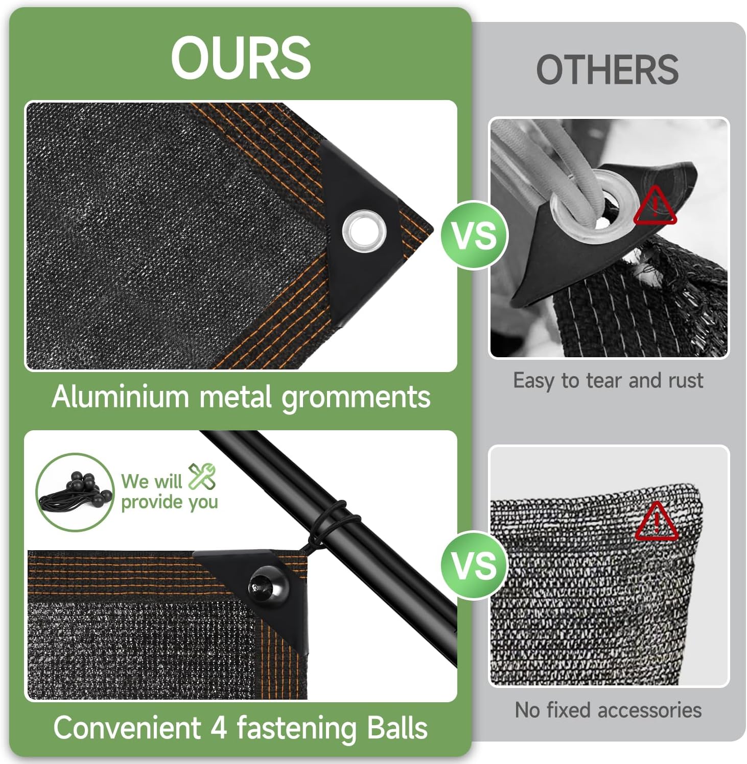 Unique Design – 4 corners of the sunshade net have triangular protection corners and with aluminium grommets in every 1.65ft and 6 bungee balls and 20pcs twistties which makes it easier to hang and looks better and beautiful.