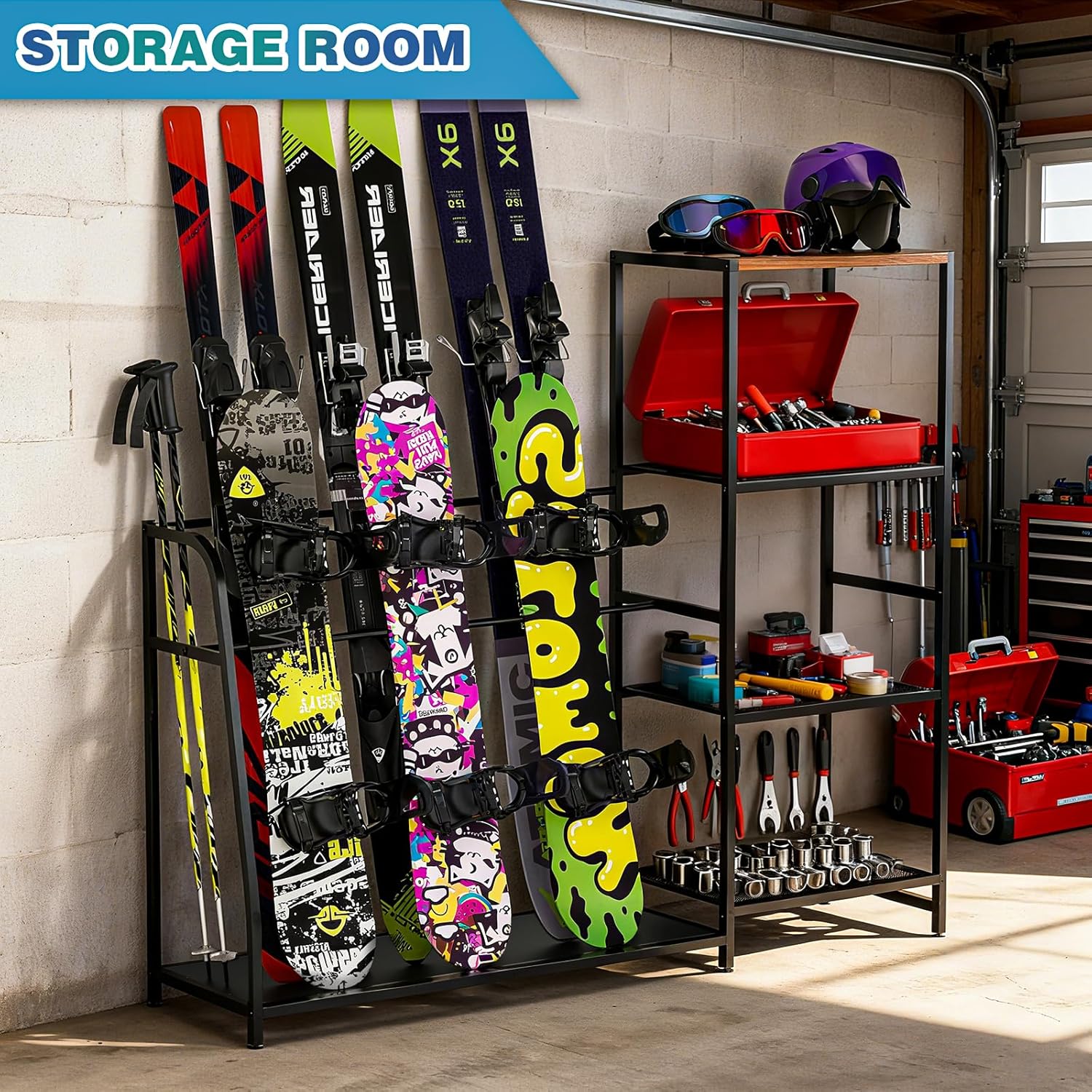 SKI SNOWBOARD RACK: This ski rack keeps your gear neatly organized. It offers ample storage space. Ideal for underground garages, ski resorts, and ski shops. It’s the perfect gift for any ski enthusiast.