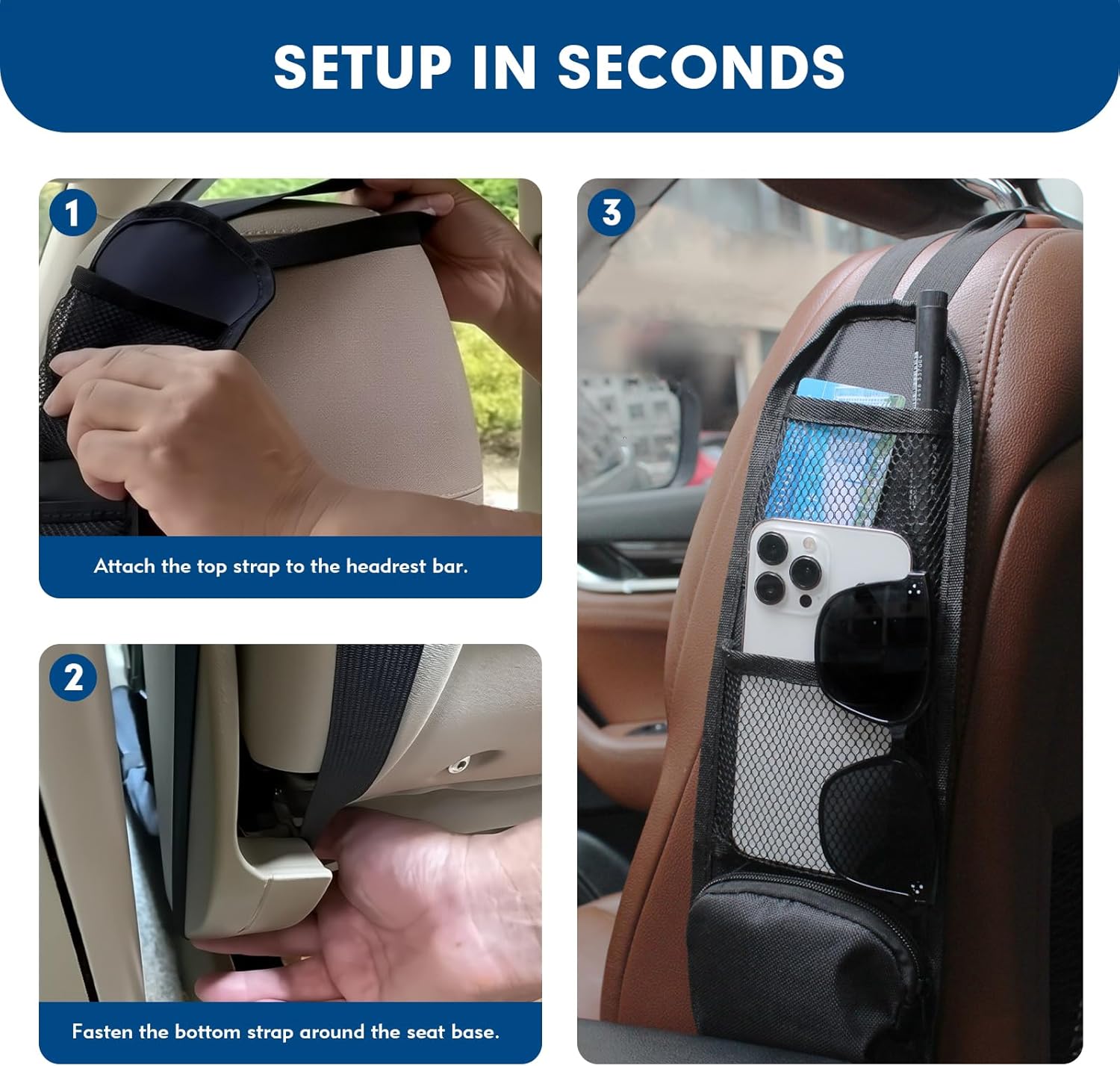 [Effortless 10-Second Setup for This Car Organizer Bag]Secure this car organizer bag in seconds! The durable elastic strap wraps around the headrest bar and seat base, ensuring a snug and wobble-free fit. Ideal for quick car camping essentials preparation.