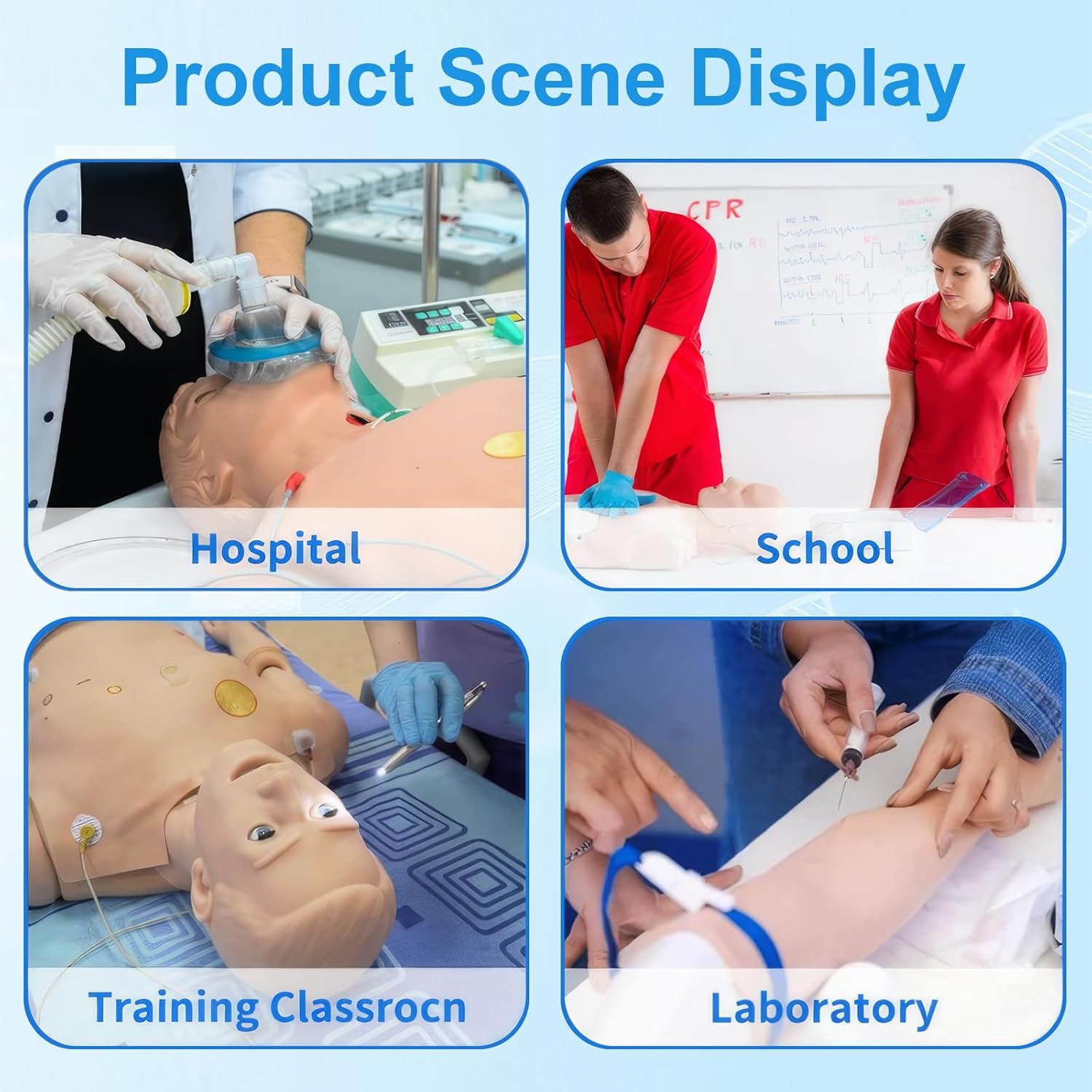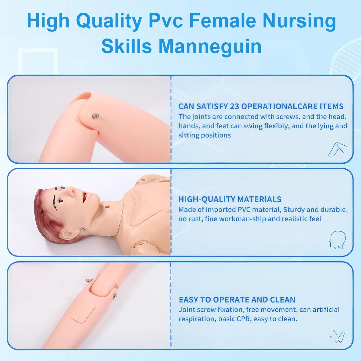 MULTIFUNCTIONAL CLINICAL SKILLS MANIKIN — The nursing training manikin masters 25+ skills including catheterization (male/female), tracheal intubation, IV insertion, pressure ulcer staging (4 phases), trauma wound care (abdominal sutures, leg injuries), and geriatric mobility simulations