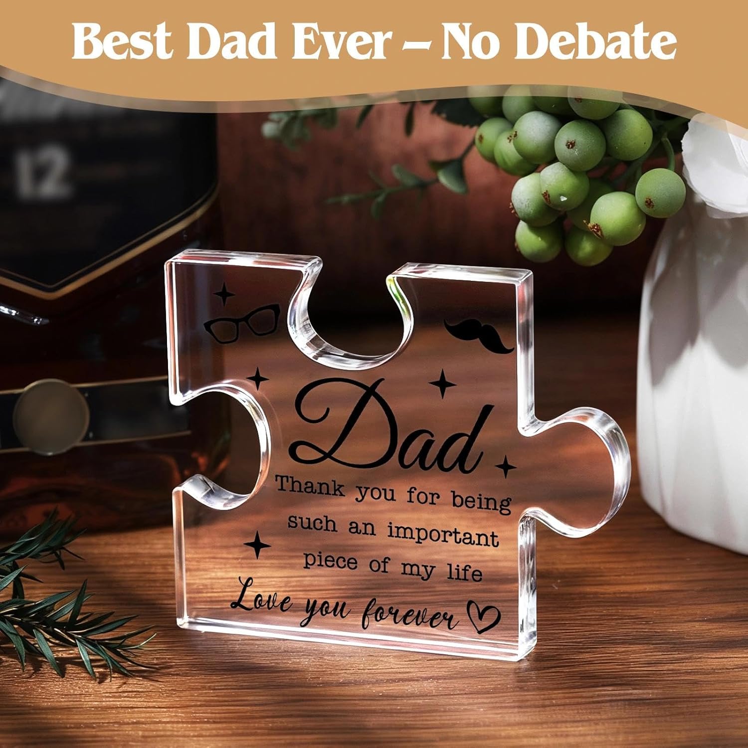 Cool Father Gifts from Children: The funny dad socks are crafted from soft, breathable cotton, keep his feet comfortable all day, and best of all, the hilarious hidden message is sure to make him laugh. The acrylic puzzle decoration is a cute keepsake he can place on his desk, shelf, or any favorite spot, adding a touch of warmth to his space. Made of durable stainless steel, this keychain is small but meaningful, letting him carry a piece of your love wherever he goes.