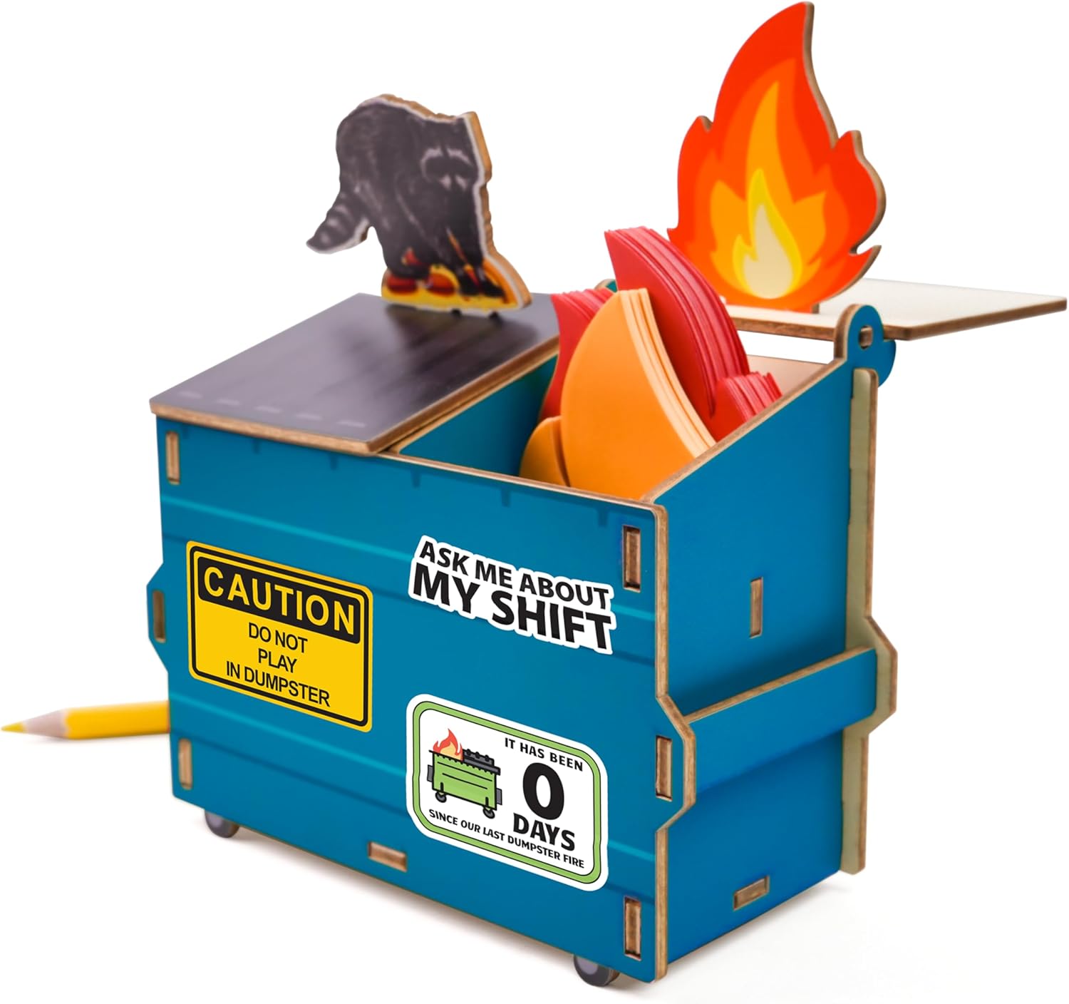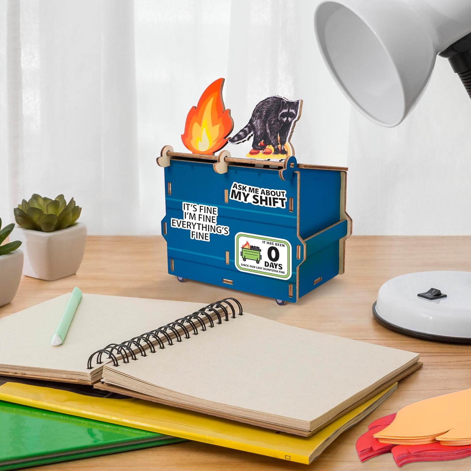 HILARIOUS DUMPSTER FIRE THEME WITH DECORATIVE PIECES: Add a touch of humor to your desk with this unique pencil holder designed around a playful dumpster fire concept. Complete with raccoon and flame-shaped decorative pieces, this organizer transforms your workspace into a fun and quirky environment that’s sure to be a conversation starter among coworkers and friends.