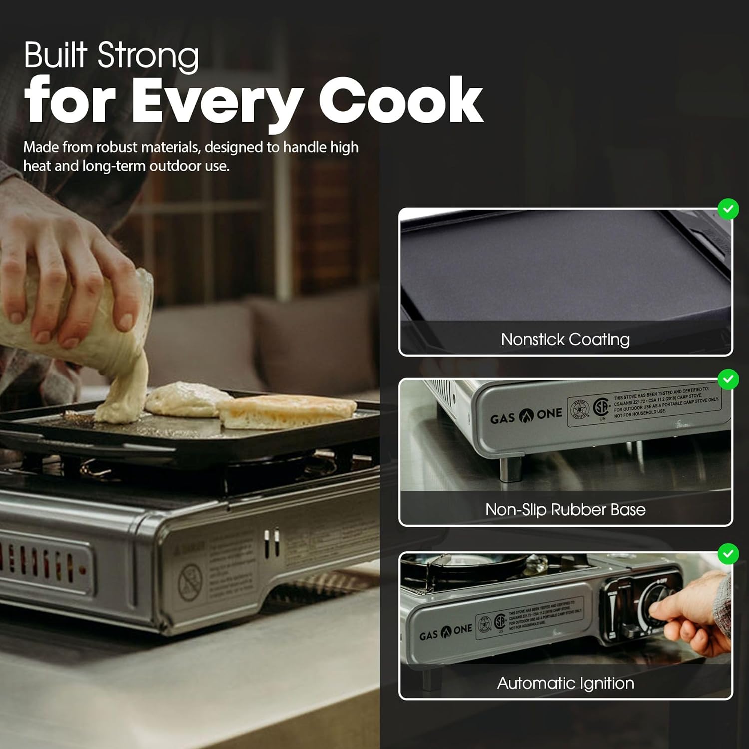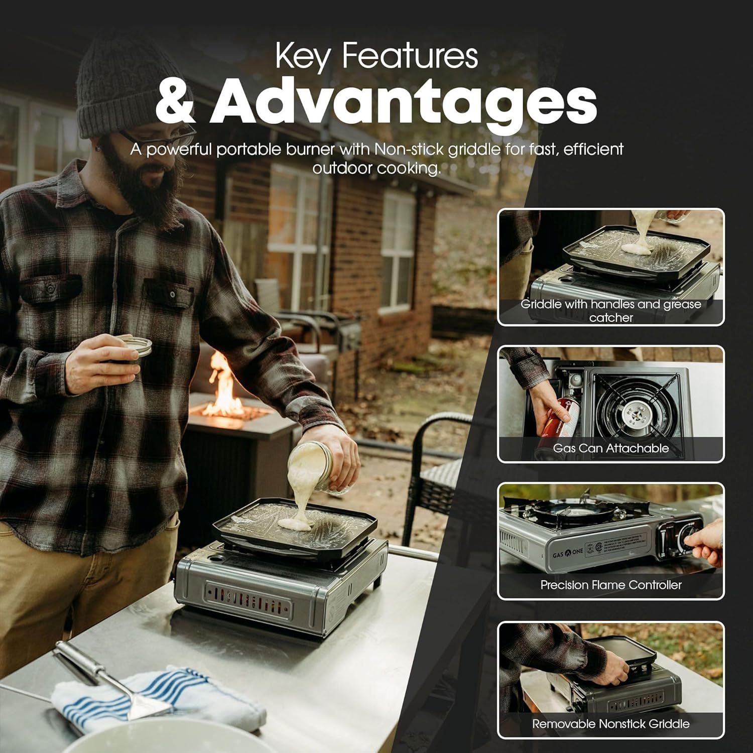 Nonstick Griddle Included: The GasOne portable gas grill comes with a diecast aluminum griddle featuring a durable nonstick coating for even heat distribution and easy cleanup. Ideal for cooking breakfast, grilling meats, or preparing meals outdoors or in small spaces.