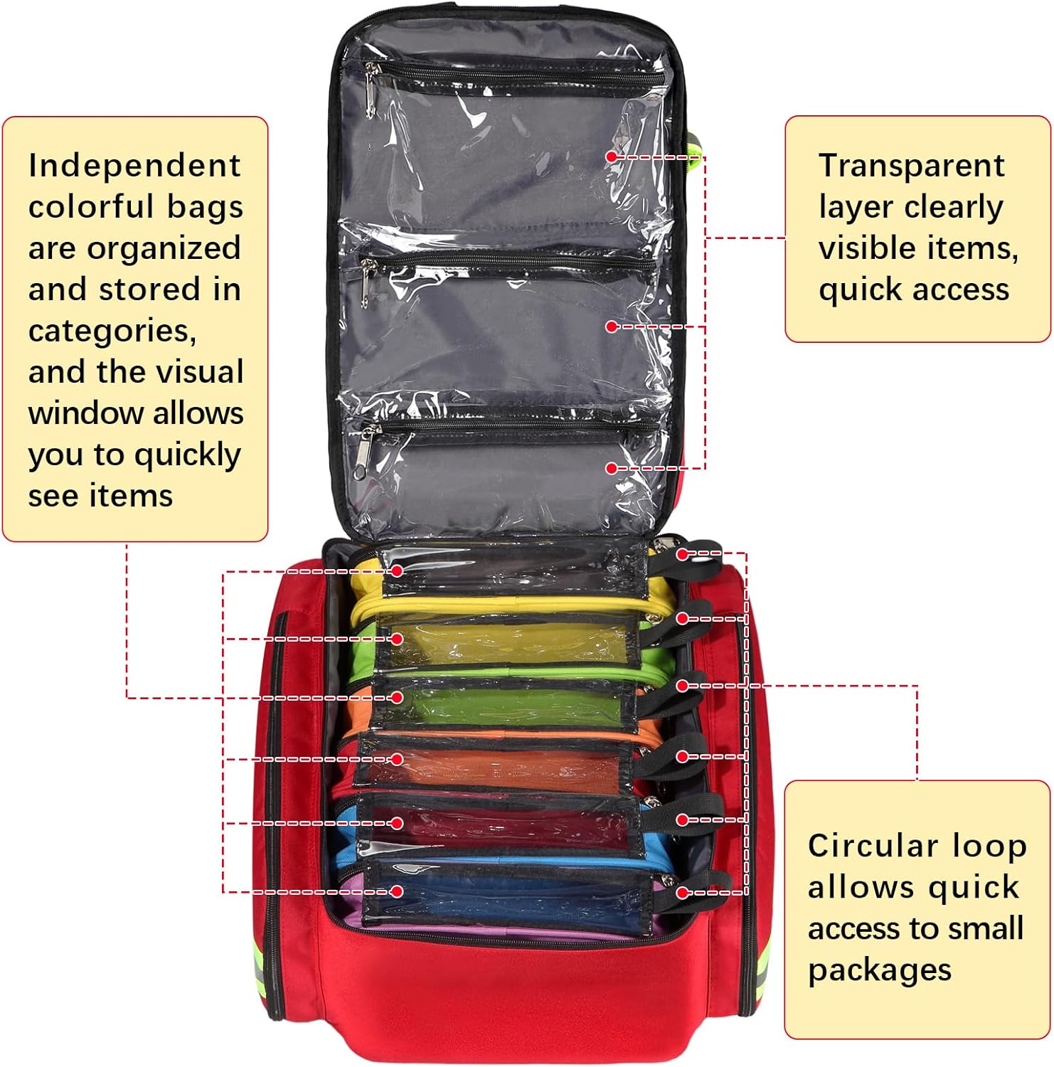 Brightly Colored Sorting Pouches: Includes six differently colored pouches (red, green, blue, purple, red, orange) for quick identification and access to needed items. These pouches help in the effective organization and categorization of various medical items such as bandages, medicines, dressings, etc.