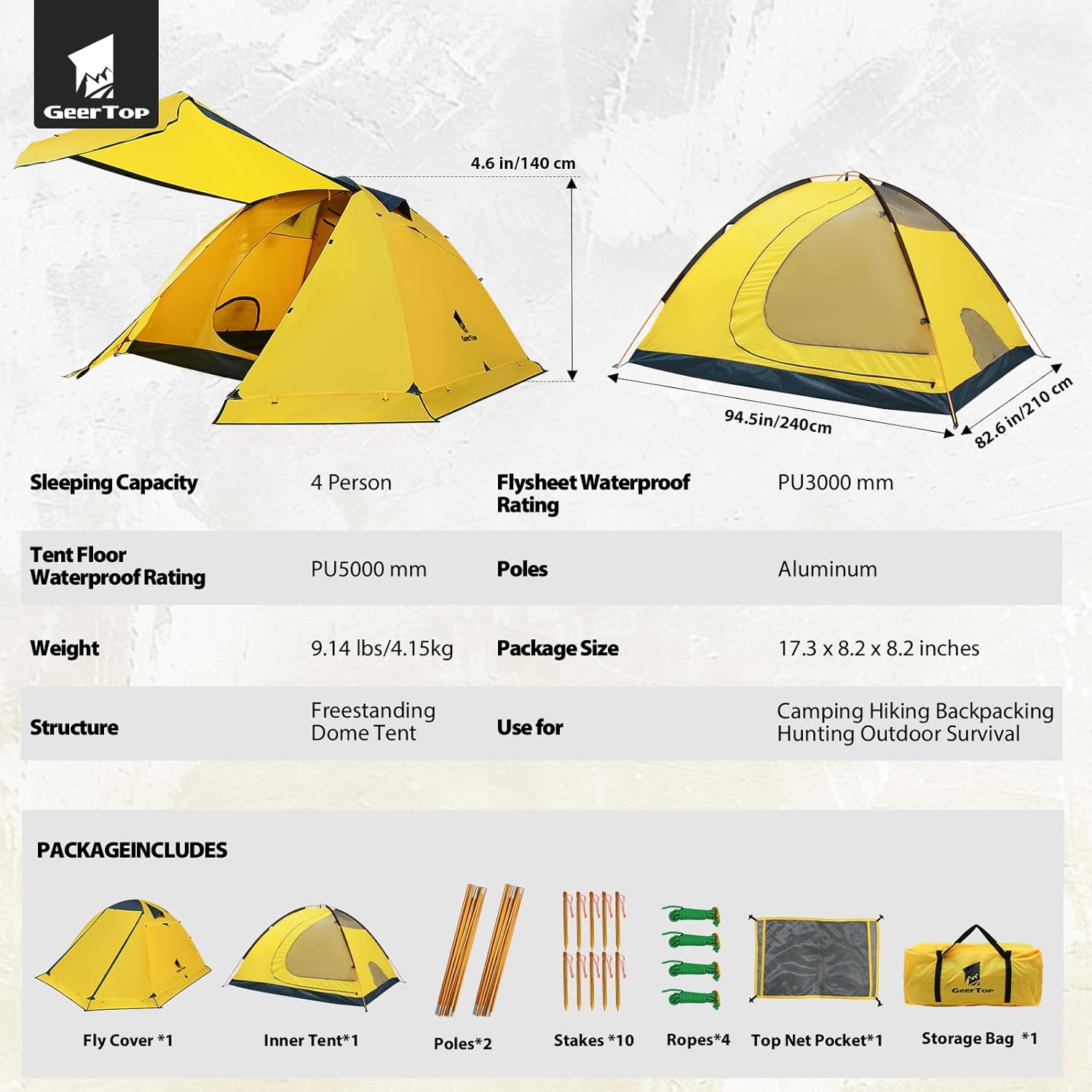 【Easy to Set Up Tent】Just only take a few minutes , quick & easy to set up even for one person , just only need to install 2 poles, Geertop dome tent perfect for 4 person, family camping, hiking, backpacking, outdoor sports, travel etc.