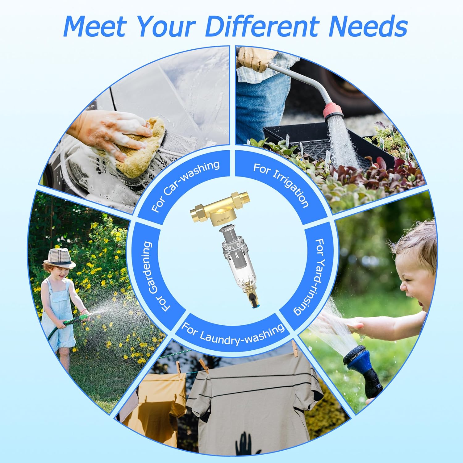 Efficient Filtration for Cleaner Water: Use the MewMore garden hose sediment filter to effectively captures sediments, debris, rust, and sand particles to protect pressure washers, yard sprinklers, water collection devices, washing machines, etc. from sediment troubles and extending the filtration system and equipment service life. Choose it for cleaner, safer water at home.