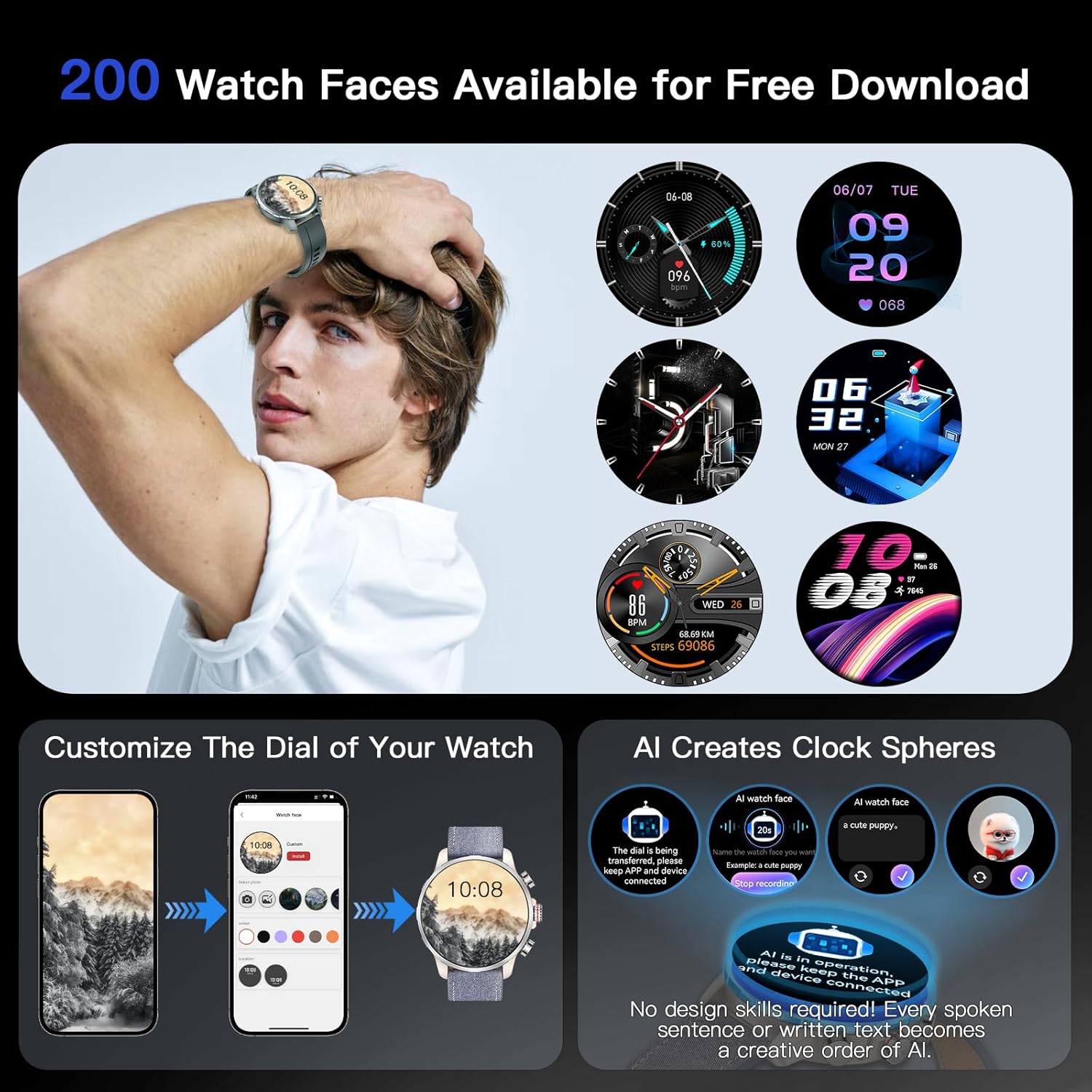 SMART NOTIFICATIONS & VERSATILITY: Get real-time notifications for social media messages, emails, and texts directly on your wrist, ensuring you never miss important information even when your phone is out of reach. This smart watches for men also includes practical daily features such as time display, weather forecast, music control, camera control, alarm settings, and phone finder. It’s an excellent companion for everyday life!