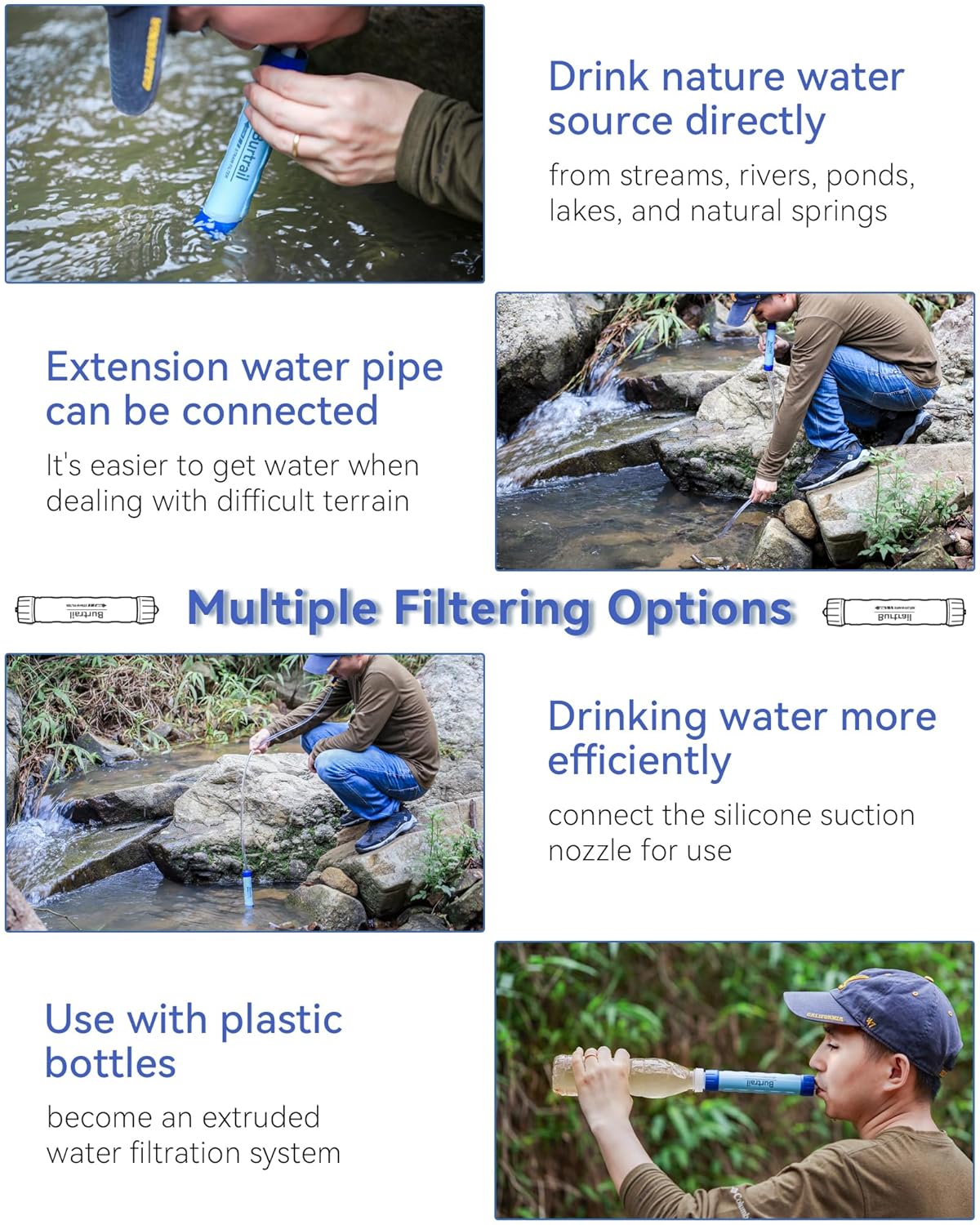 Multi-scene Application: As a necessity for outdoor water purification, the Burtrail Gravity Water Filter is applicable to camping, hiking, backpacking, emergency preparedness (rainstorms, floods, earthquakes, hurricane, etc.) to meet the emergency water demand in a variety of situations