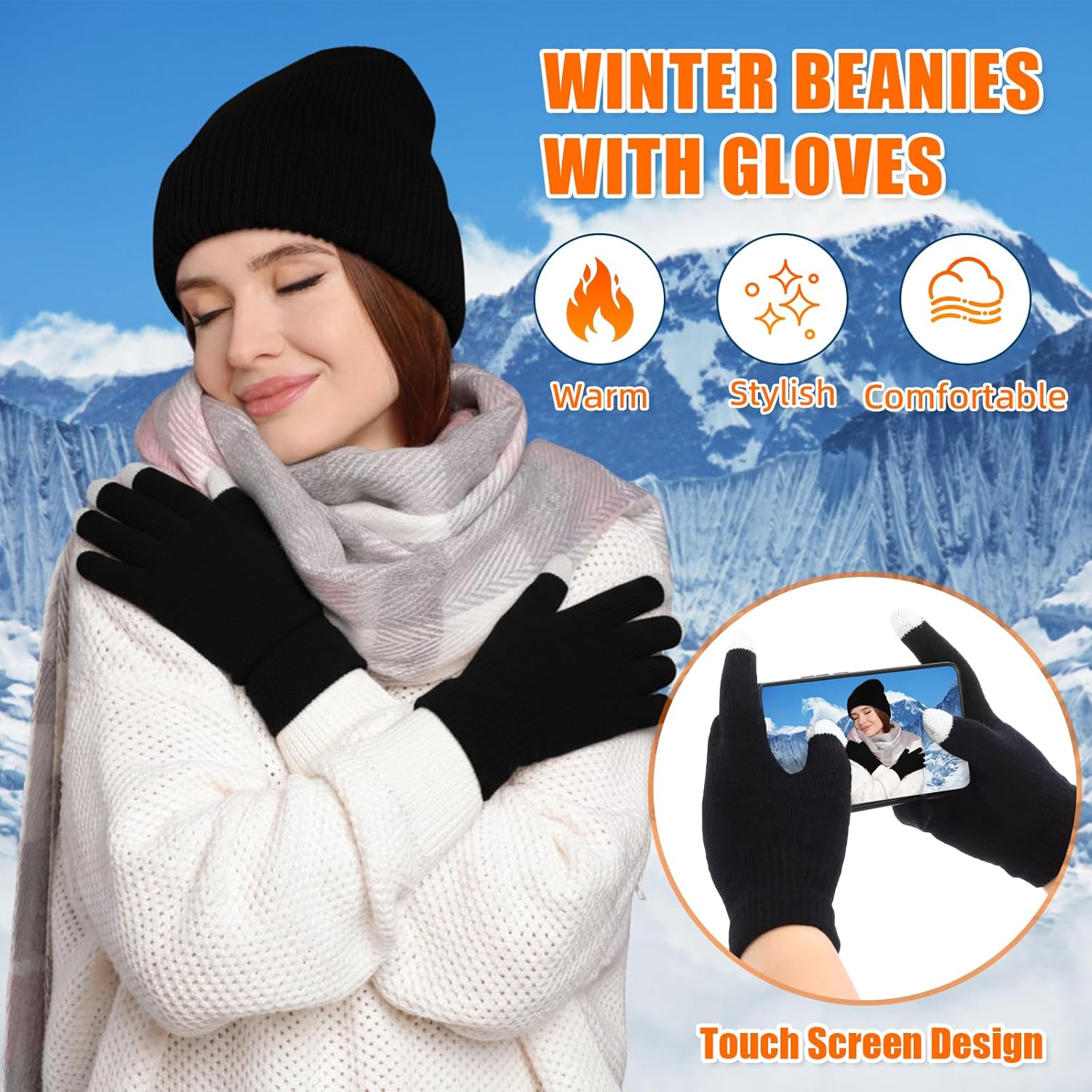Thermal socks, gloves, and a beanie: The beanie and gloves are made of stretchy acrylic fabric for enhanced warmth. These thermal gloves feature a touchscreen design, allowing you to send messages or take photos outdoors without having to put them on or take them off. These black hiking socks are made of ultra soft fabric that’s breathable, warm, and moisture wicking, keeping your feet dry and comfortable