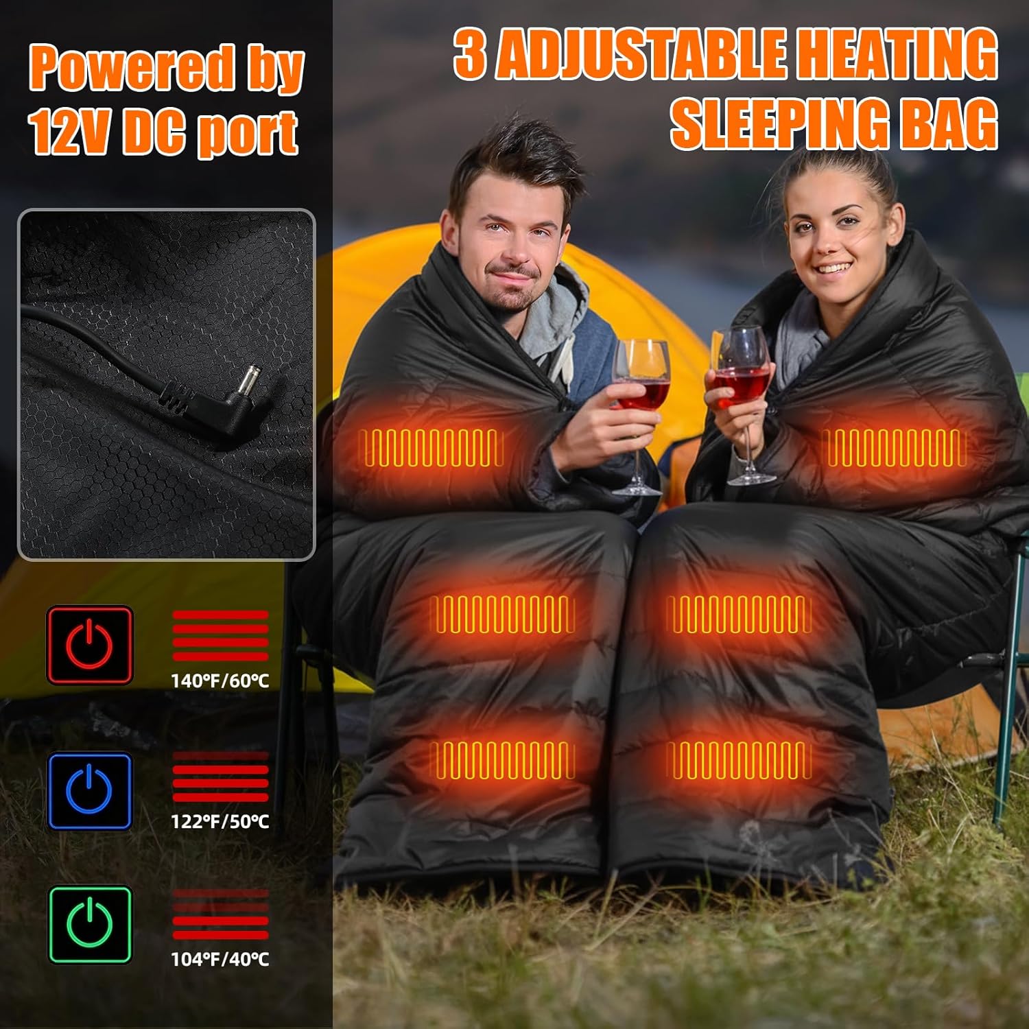 Adjustable Heating Sleeping Bag: this rectangular sleeping bag design is an envelope basic, size is about 90.6 x 70.9 inches/ 2.3 x 1.8 m, powered by 12V DC port (Not Include Power Bank), it can safely keep you warm all over the night; The heating area sleeping bags has 3 adjustable heating levels, green meaning low 104℉/40℃, blue meaning medium 122℉/50℃ and red meaning high 140℉/60℃, keeping your whole body warm in the cold winter