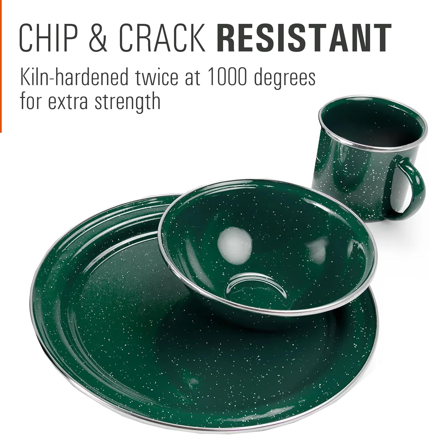 BUILT TO LAST & DISHWASHER SAFE: Heavy‑gauge steel pieces with porcelain‑glazed enamel finish and stainless rims, kiln‑hardened twice at over 100°F to resist chips, scratches, and rust. Suitable for dishwasher or hand‑washing.