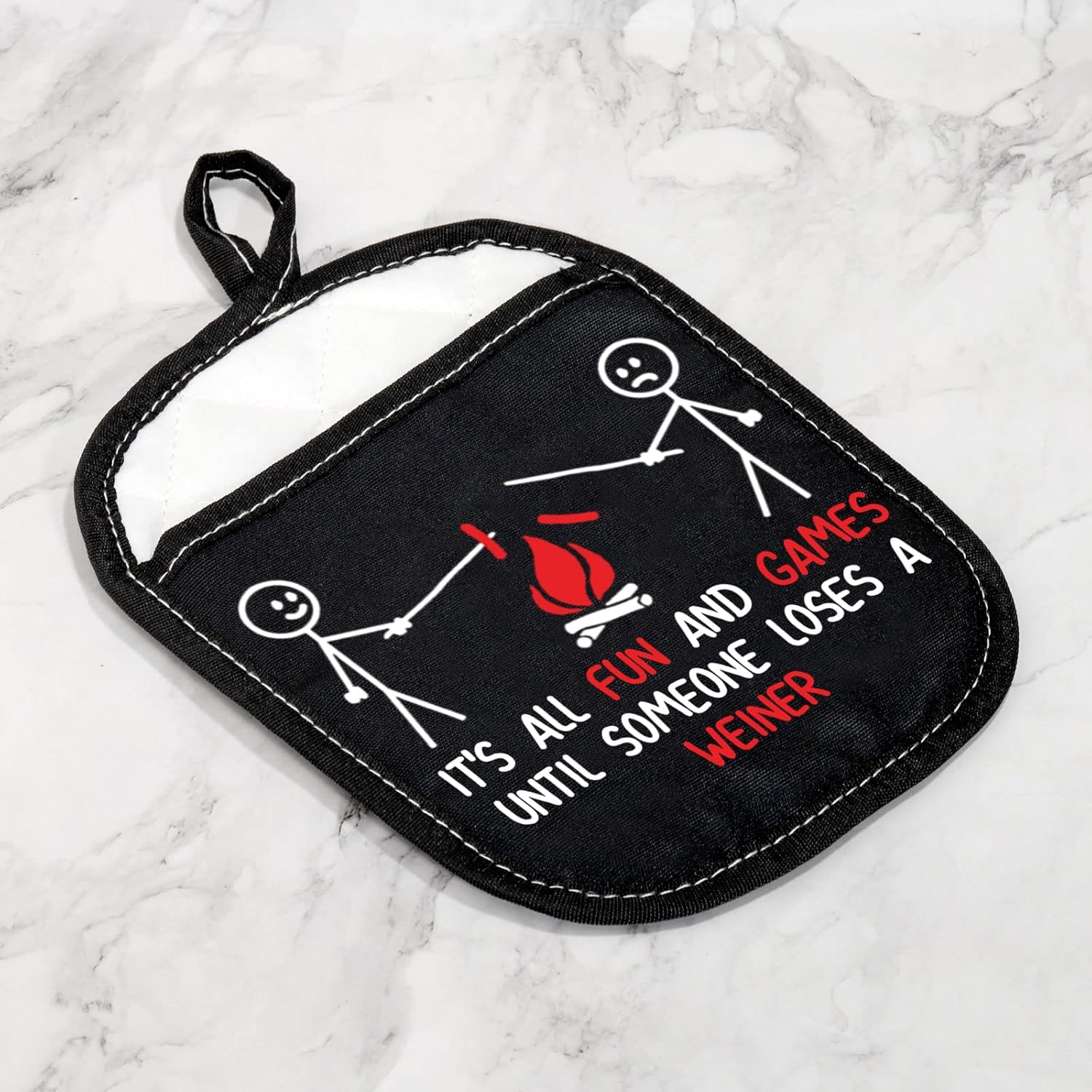 Pot Holders With Camping Quote: It’s All Fun And Games Until Someone Loses A Weiner. Great gift for Camper, Camping Lover, Outdoor Hiking Lover and Wanderlust.