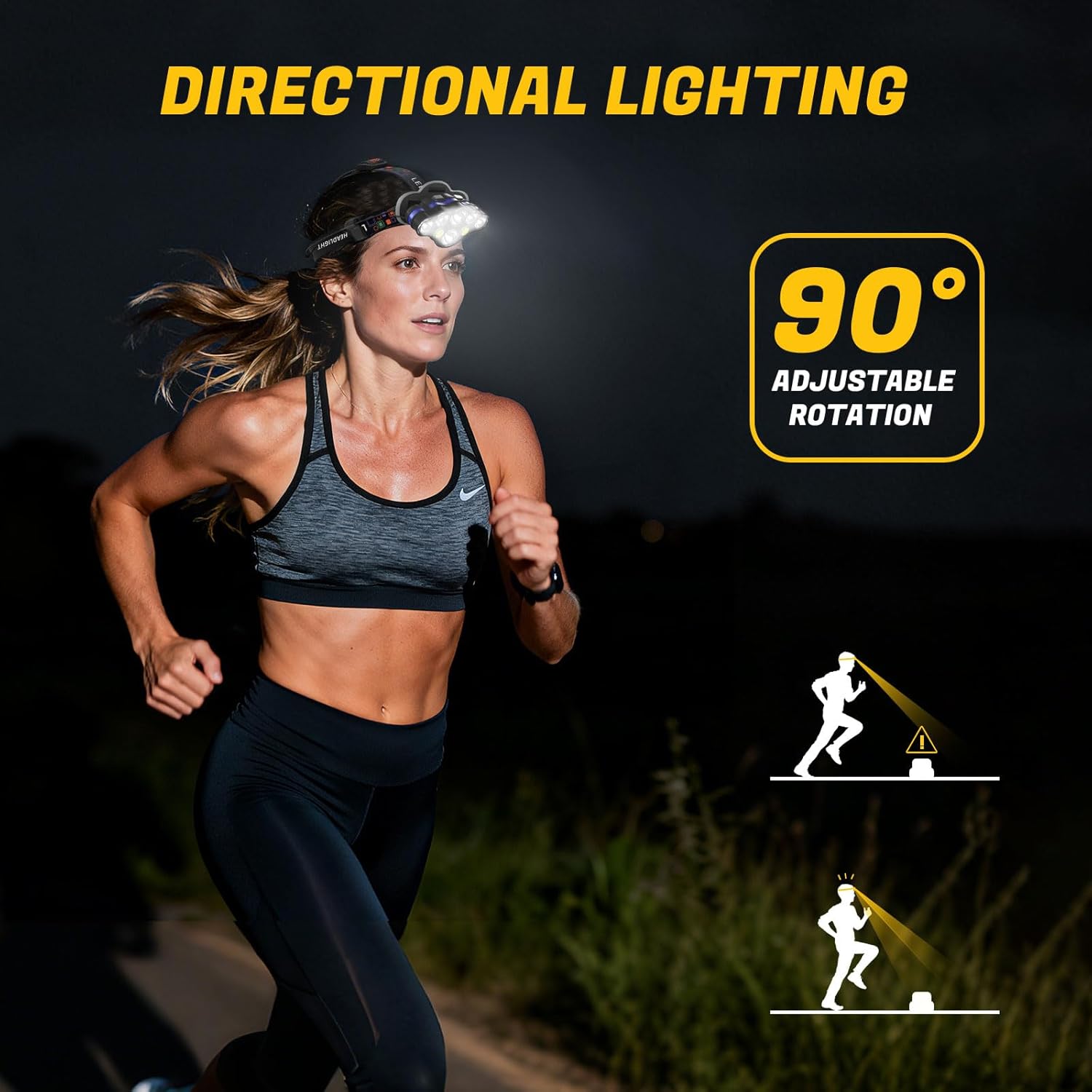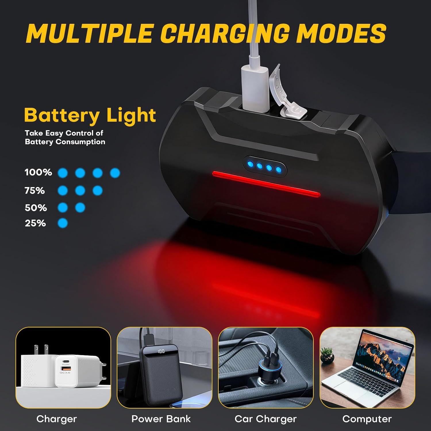 Battery Indicator & Red Warning Light: The headlamp rechargeable supports USB-C fast charging. Depending on the lighting mode, this rechargeable headlamp delivers 4-10 hours of continuous runtime, keeping you powered throughout your adventures. Equipped with four LED indicators, it displays remaining battery life in real time, ensuring you always know when it’s time to recharge. The red safety warning light switch is located on the back to ensure all direction safety and emergency response.