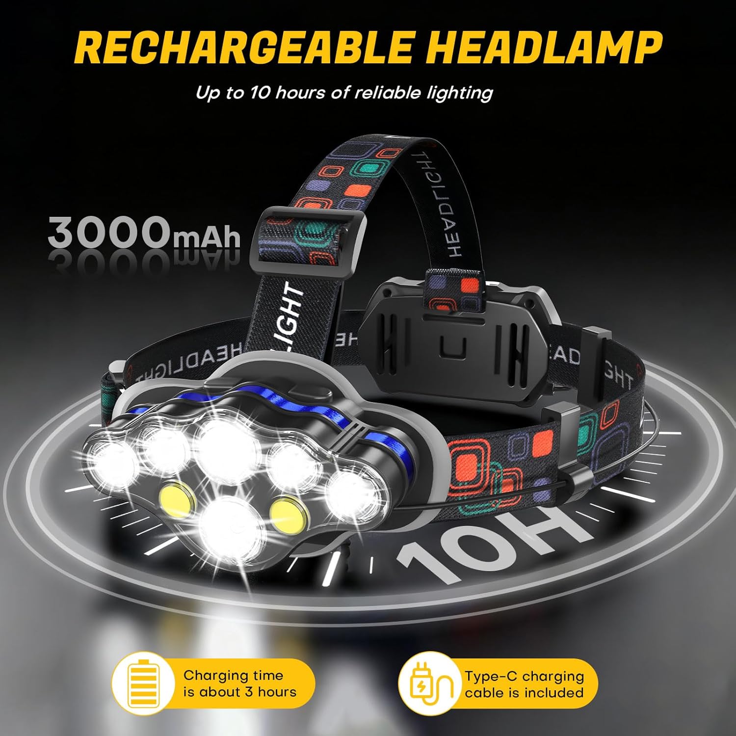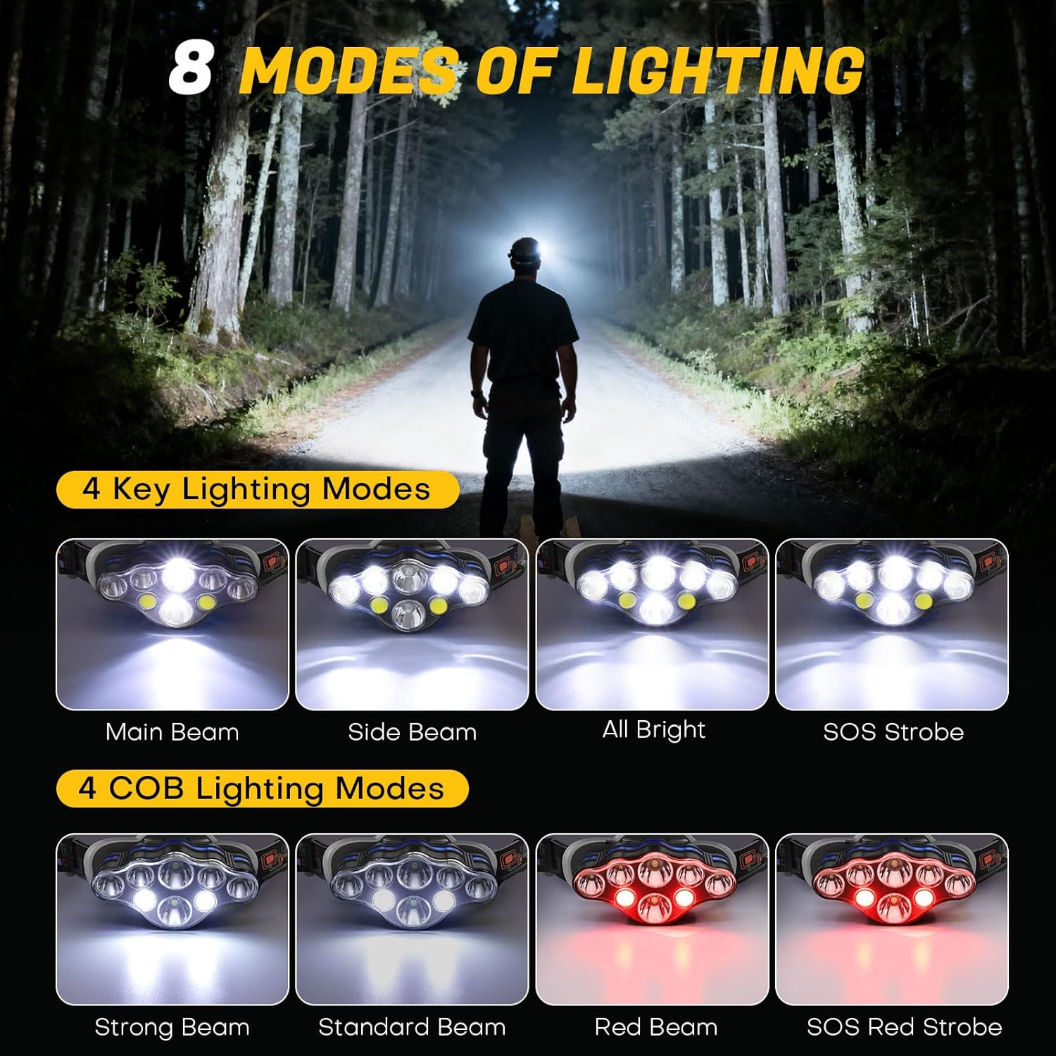 8 Lighting Modes & Long Press Function: MIOISY headlamp features 8 powerful led bulbs that provide high lumens. One-button control main light mode: main beam, side beam, all beam, and SOS strobe. One-button control COB mode: strong beam, warm beam, red light, SOS red strobe. Our head lamp have added extended functions. In any lighting mode, press and hold the mode button for 3 seconds to turn off the light directly, without going through all modes.