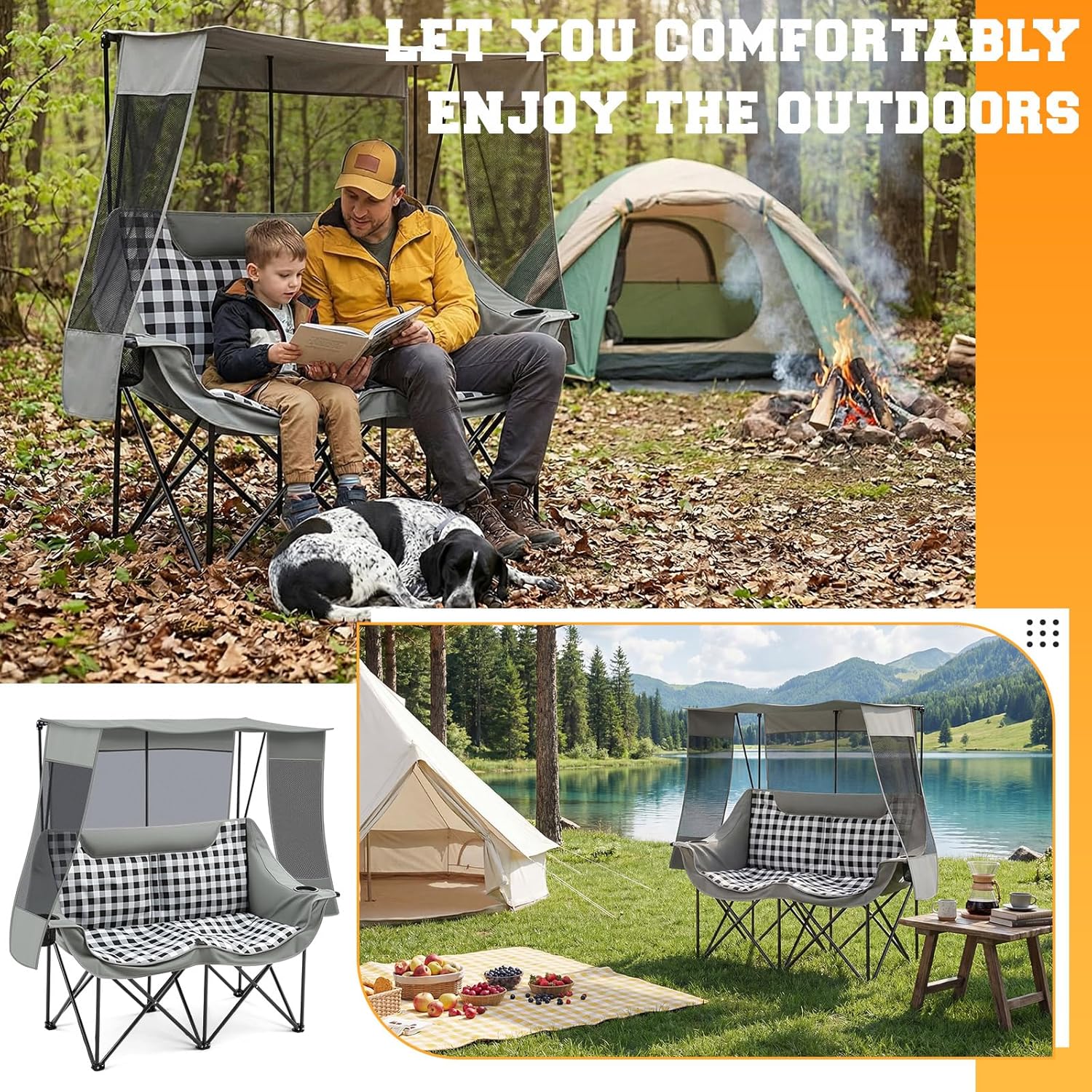Stay Warm and Shade from the Sun: enjoy your outdoor adventures without worrying about direct sunlight! Our double camping chair features side and rear visors that effectively block sunlight from all angles, ensuring maximum cooling and effective UV protection in windy weather; The side visors can be easily secured with adhesive strips, and the awning’s internal buttons fully extend to keep the chair warm during winter use
