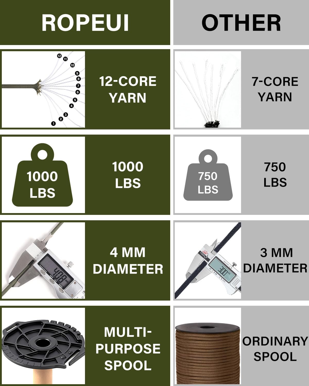 1000lb Strength, 12-Core Build Engineered for unmatched durability, our paracord features a rugged 12-core design and supports up to 1000lb of tensile strength. Tough enough for survival, camping, and heavy-duty outdoor use—reliable in any condition.