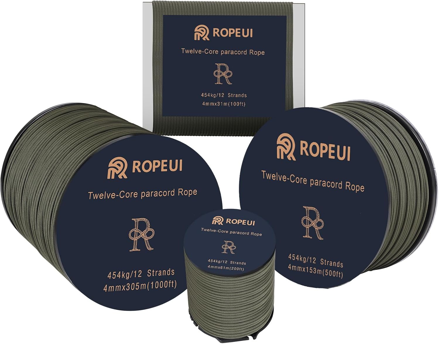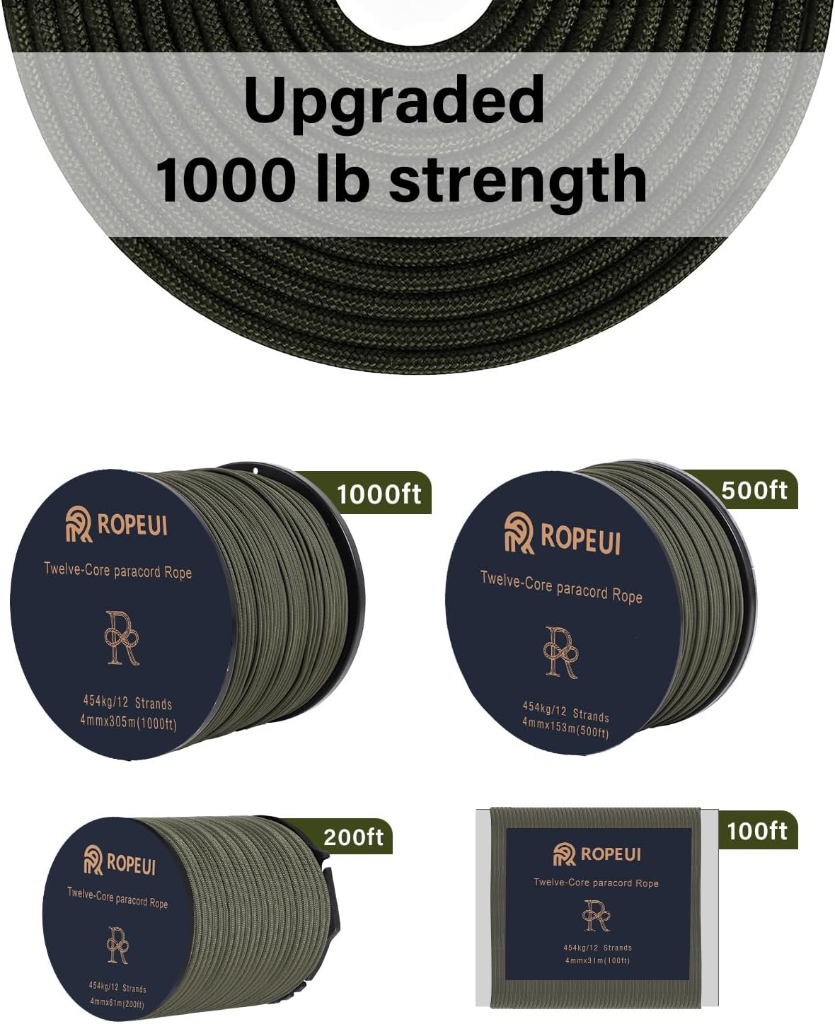 1000lb 12-core paracord, built strong and reliable for camping, hiking, survival, and emergencies. The 200ft option includes a spool with cutter, scale, wire guide, and lock slot for easy use and storage. Perfect for tent lines, hammocks, bracelets, lanyards, and DIY projects.