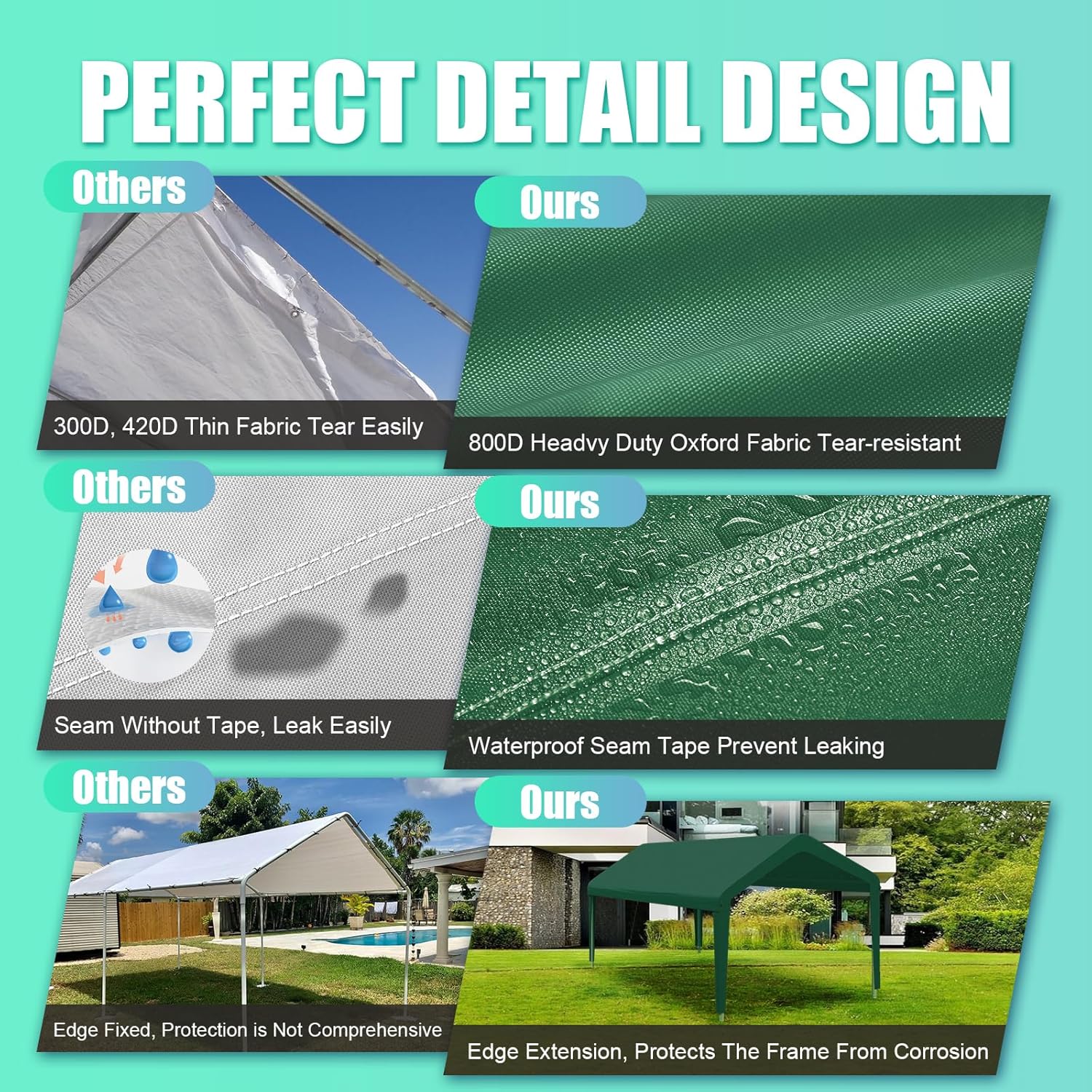 Rainproof Edge Cover – We made lengthening designs on the carport roof tarp, the edge of the top cover is lengthened to 11.5inch, protect the frame from rainwater penetration and also strengthen the tarp, prevent tearing.