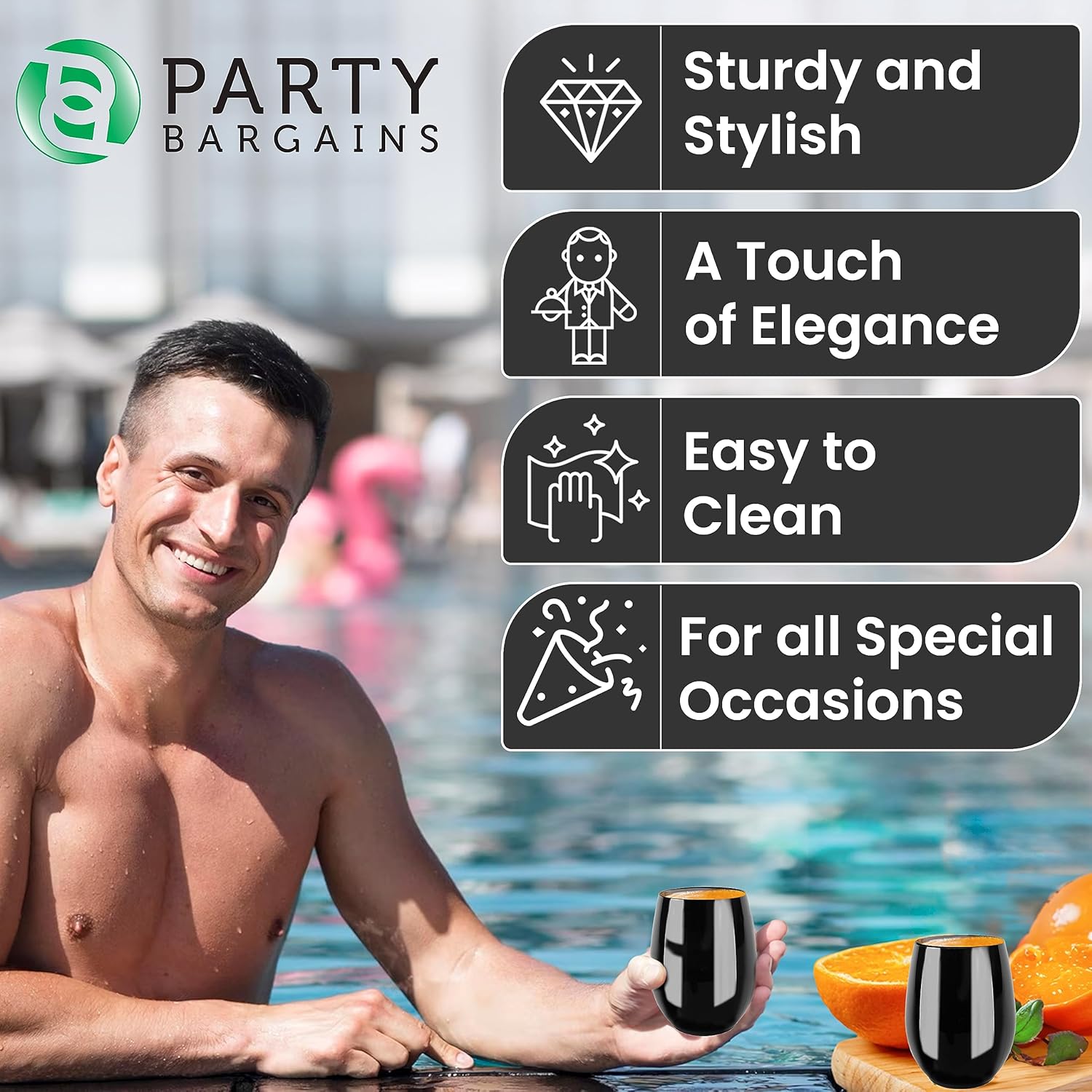 SLEEK BLACK DESIGN – Classic black stemless goblets add a clean, modern look to weddings, baby showers, anniversaries, and special celebrations.