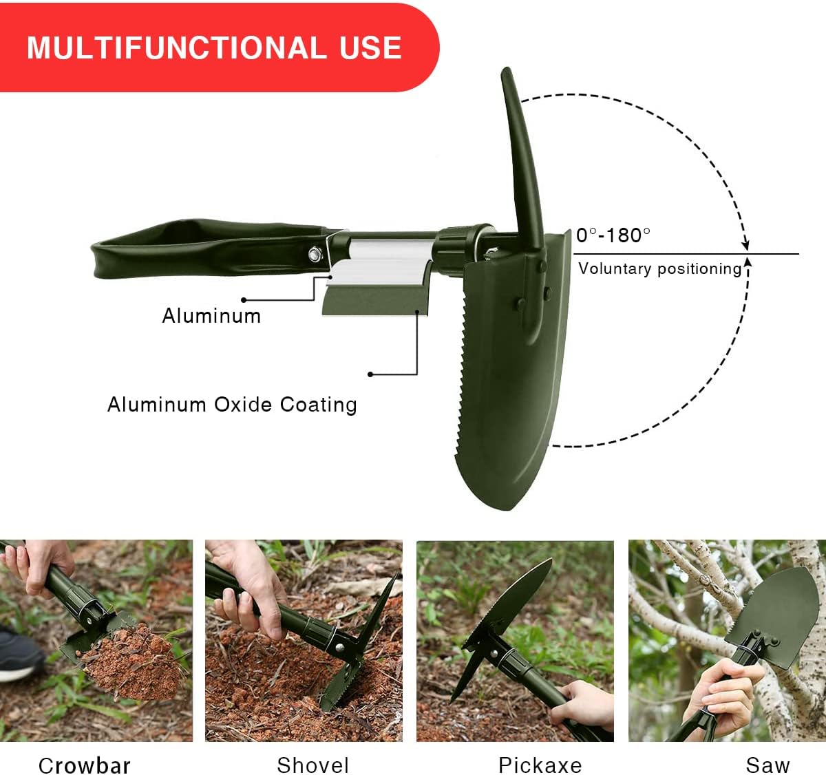 Multifunctional Survival Shovel: The shovel is designed and produced for outdoor sports lovers and gardening enthusiasts. It’s also the perfect companion for camping adventures as an entrenching tool, Those are great for keeping in your vehicle in case of getting stuck in snow/mud etc.