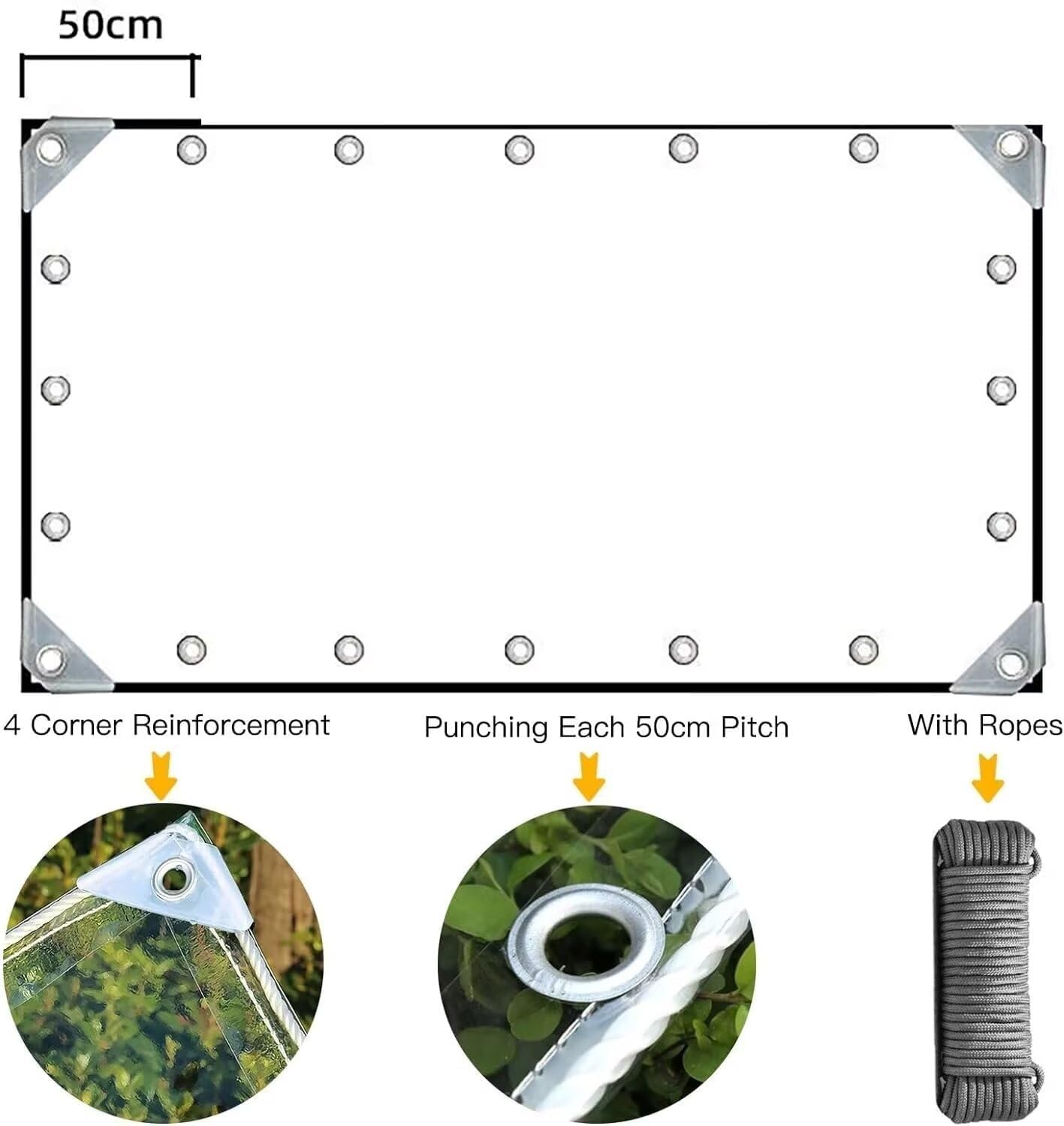 2.Heavy duty tarp features: This Transparent, Rainproof Tarpaulin is Soft, Transparent,Highly Heat-resistant, Tear-resistant, Waterproof, Sun-proof, Weather-proof, Cold Resistance, Easy To Fold, Not Easy To Deform, Easy To Clean, Etc. Suitable for All Seasons, Protect Your Surface and Objects from Damage with This Tarpaulin Cover Sheet.