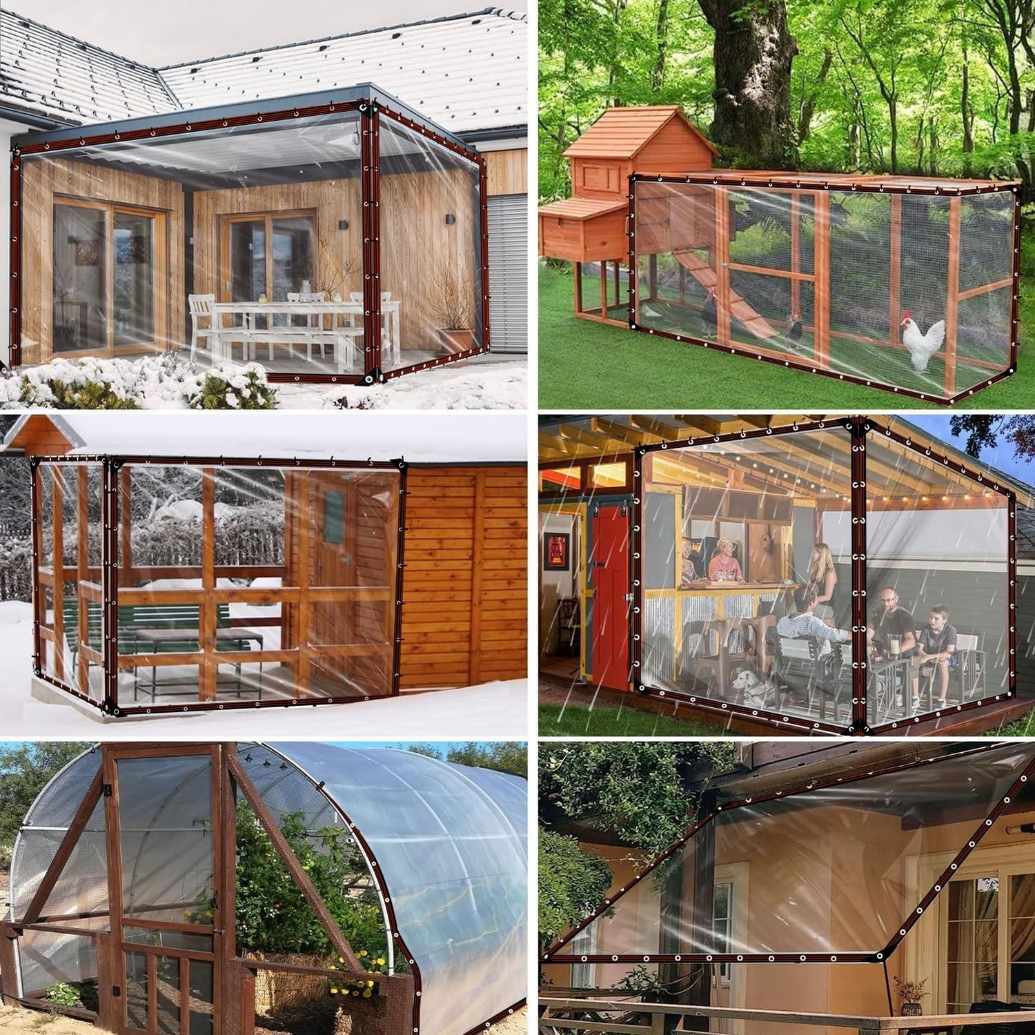 Heavy Duty Waterproof Tarp: Our clear vinyl tarp is made from high-quality updated 0.14mm vinyl plastic and have waterproof, windproof, and durability properties.This Clear Tarp can be used as a roof or wall to keep warm,and as a cover,provides a sheltered environment from wind and rain for the henhouse outdoor porches patio enclosure. Beyond a Transparent PE Vinyl Tarpaulin, it’s your transparent guardian—tear-resistant, weather-ready